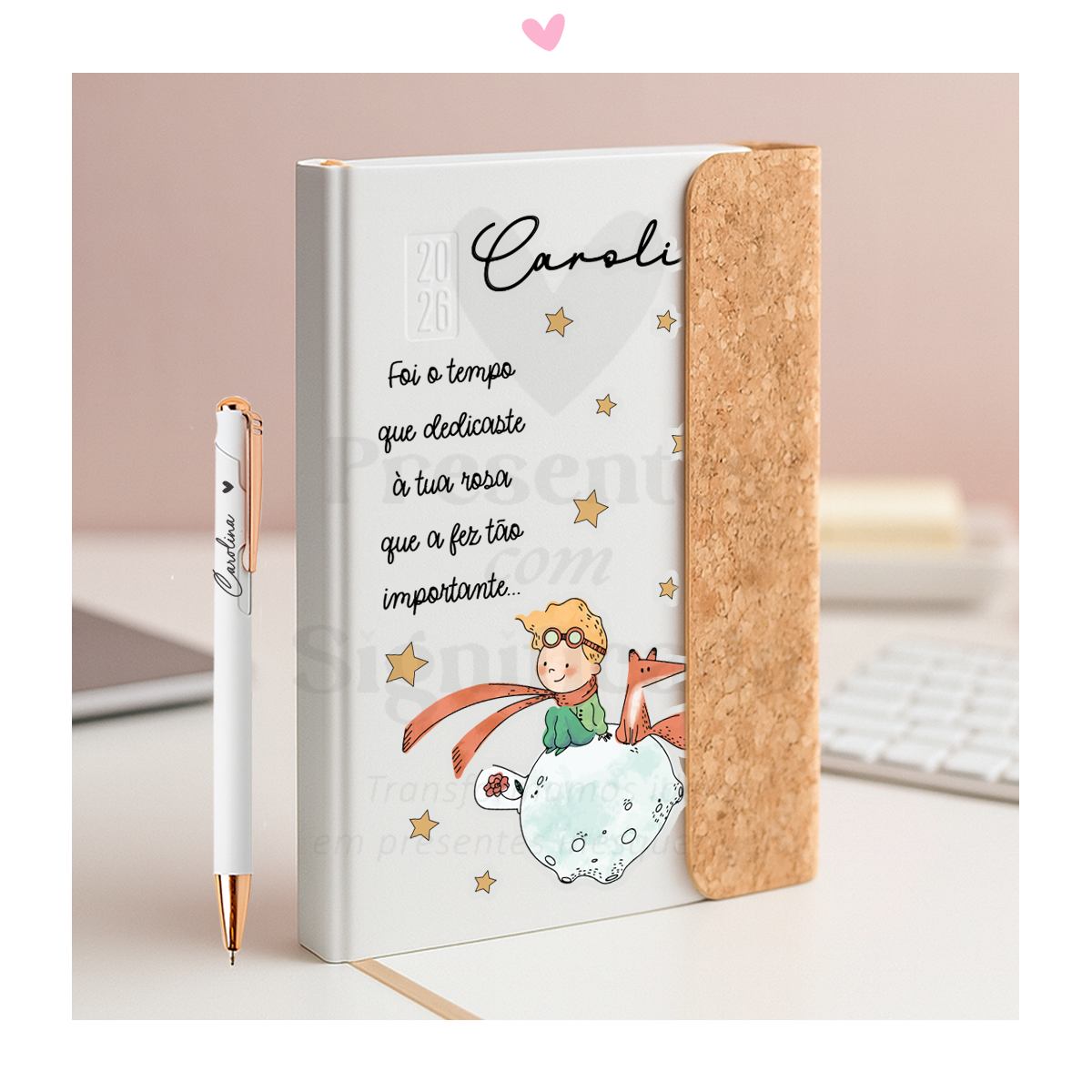 Agenda diária tamanho A5 c/ capa em imitação de pele, fecho magnético e aba em cortiça. Suporte para caneta dentro da aba. Personalize com o texto que quiser (pode adicionar fotos). Caso pretenda outro design das nossas agendas colocado neste modelo, indique no campo da personalização o nome da agendida pretendida (antes ou depois do texto a personalizar)