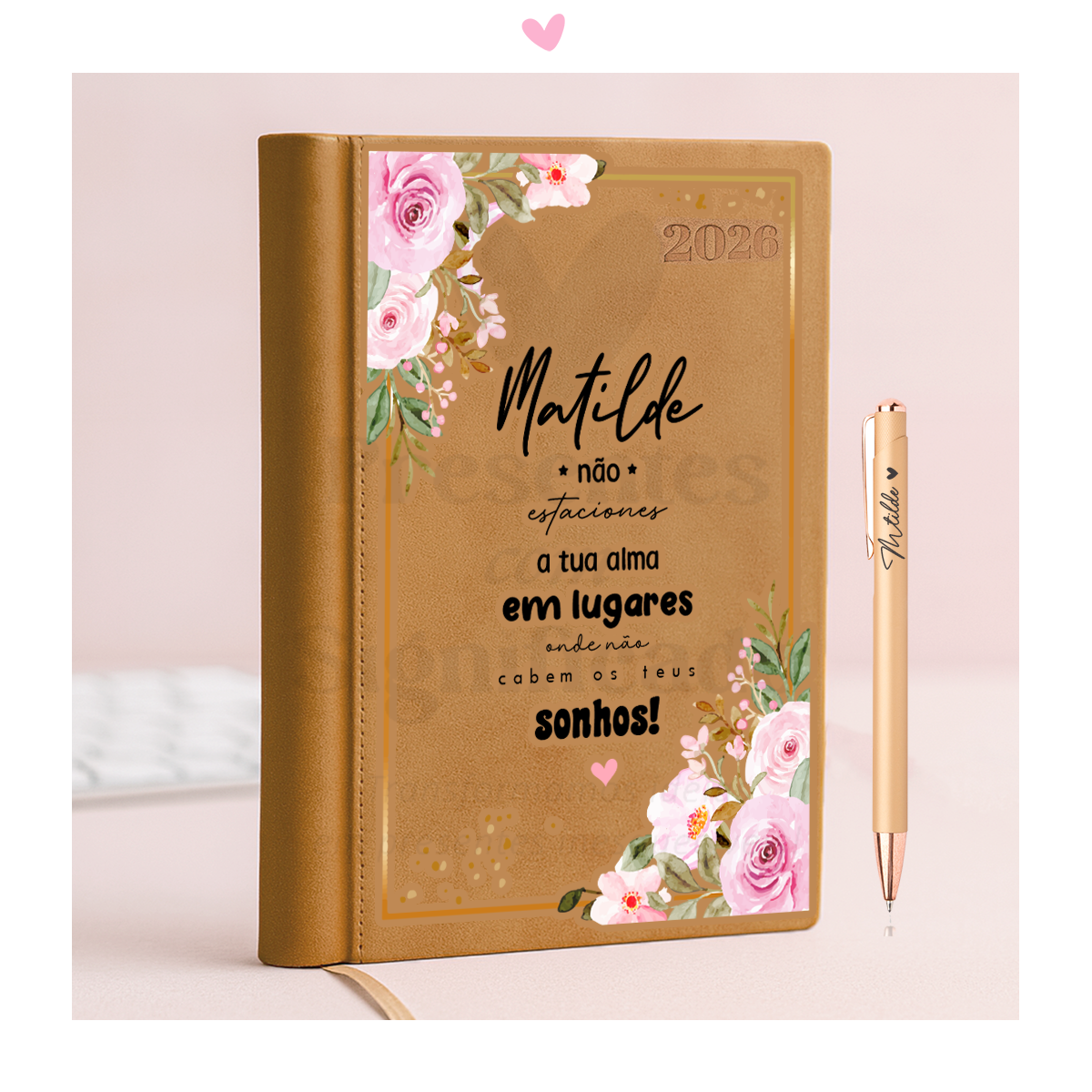 Agenda diária tamanho A5 cor camel. Capa com toque de camurça com fitilho e chapa metálica. Apresenta ainda espaço na lombada para acomodar uma esferográfica. Personalize com o texto que quiser (é possível também adicionar foto ou imagem a seu gosto). Caso pretenda outro design das nossas agendas colocado neste modelo, indique no campo da personalização o nome da agenda pretendida (antes ou depois do texto a personalizar)