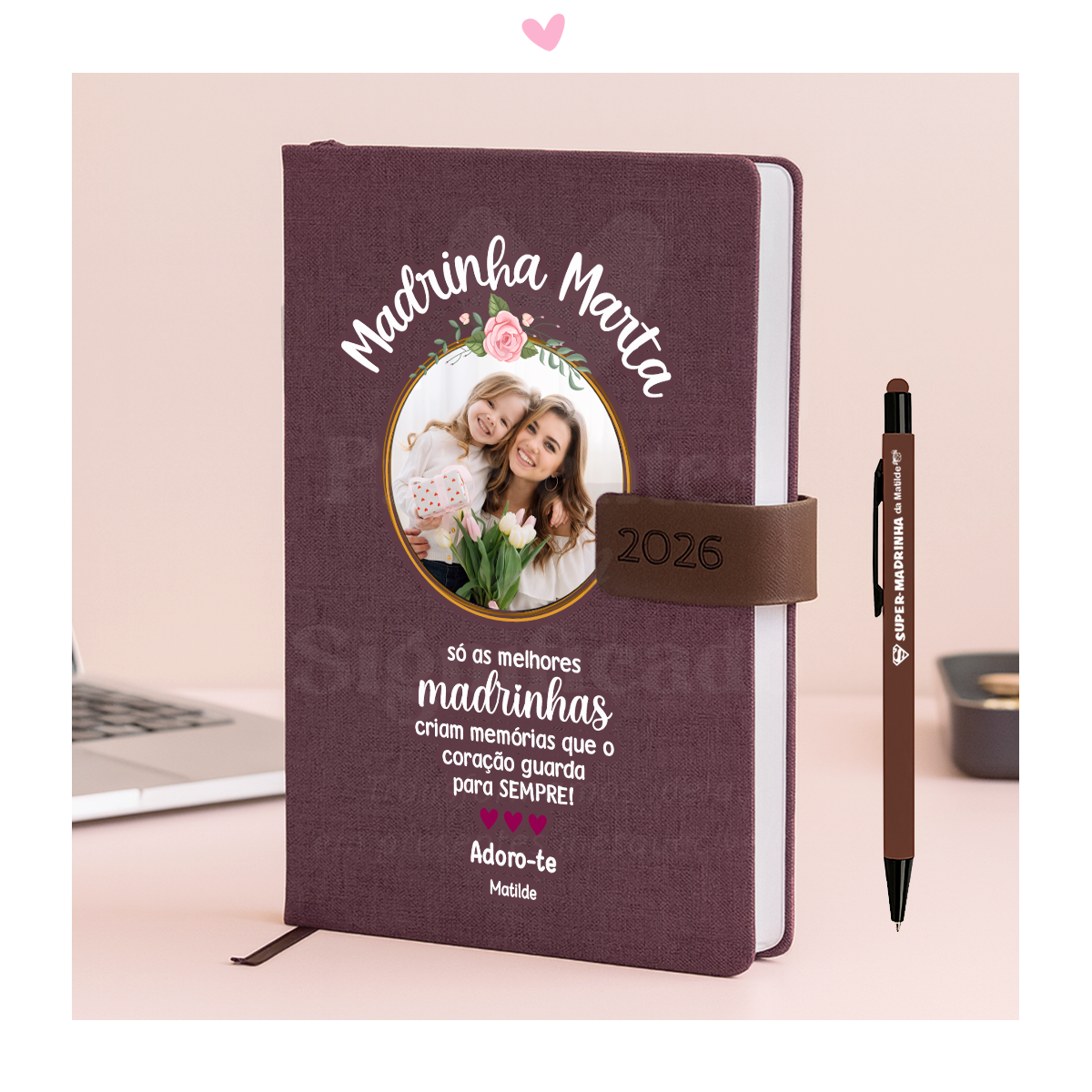 Agenda diária tamanho A5 c/ capa em linho bordaux/rosado e fecho magnético em pele sintética de cor castanha. Suporte para caneta com elástico e fitilho a combinar. Personalize com o texto que quiser (pode adicionar fotos). Caso pretenda outro design das nossas agendas colocado neste modelo, indique no campo da personalização o nome da agenda pretendida (antes ou depois do texto a personalizar)