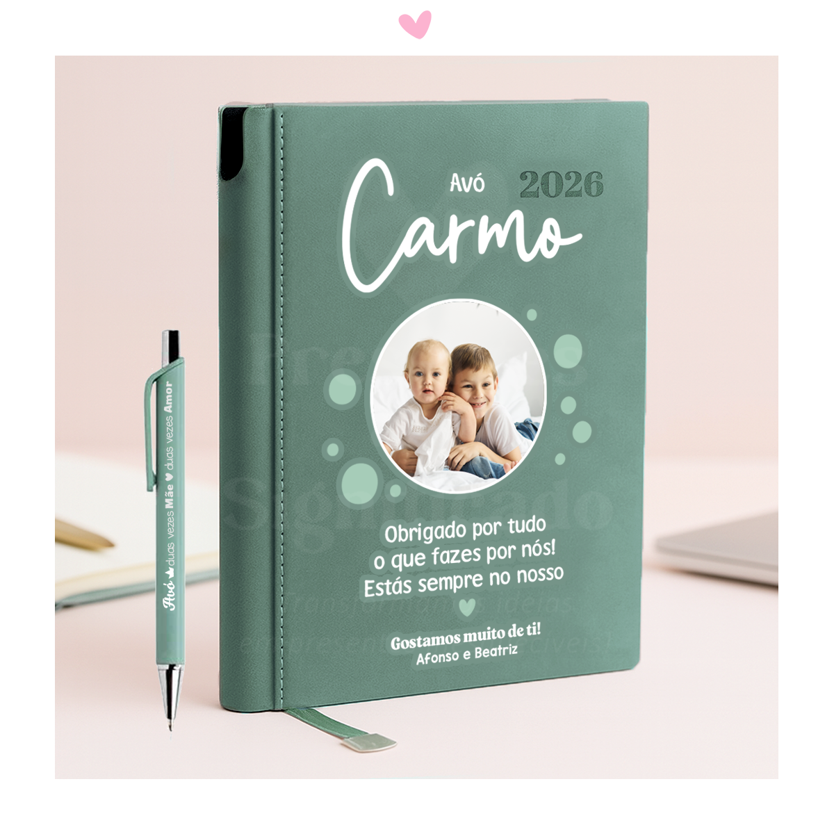 Agenda diária tamanho A5 cor verde água. Capa com toque de camurça com fitilho e chapa metálica. Apresenta ainda espaço na lombada para acomodar uma esferográfica. Personalize com o texto que quiser (é possível também adicionar foto ou imagem a seu gosto). Caso pretenda outro design das nossas agendas colocado neste modelo, indique no campo da personalização o nome da agenda pretendida (antes ou depois do texto a personalizar)