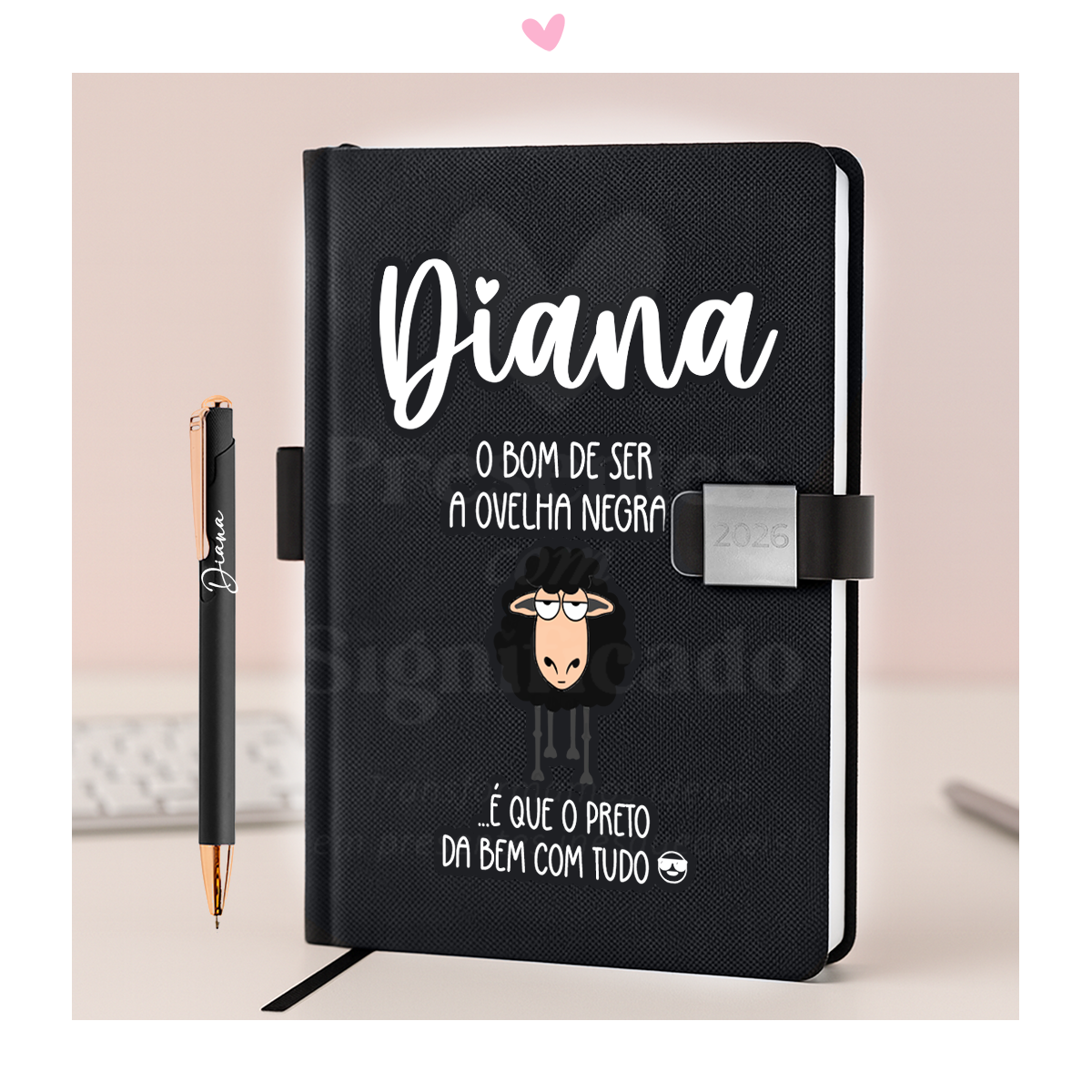 Agenda diária tamanho A5 c/ capa em tecido preto e fecho c/ chapa de metal c/ ano gravado. Fecho magnético, porta esferográficas e fitilho à cor da agenda. Personalize com o texto que quiser (pode adicionar fotos). Caso pretenda outro design das nossas agendas colocado neste modelo, indique no campo da personalização o nome da agenda pretendida (antes ou depois do texto a personalizar)