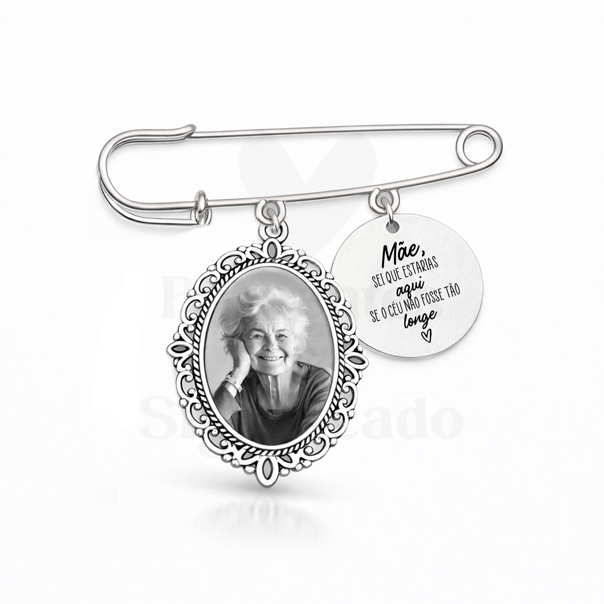 Alfinete em metal personalizado c/ pendente p/ 1 foto e medalha c/ texto. Ideal para colocar na lapela do noivo ou presa no ramo. Disponível em dourado ou prateado.