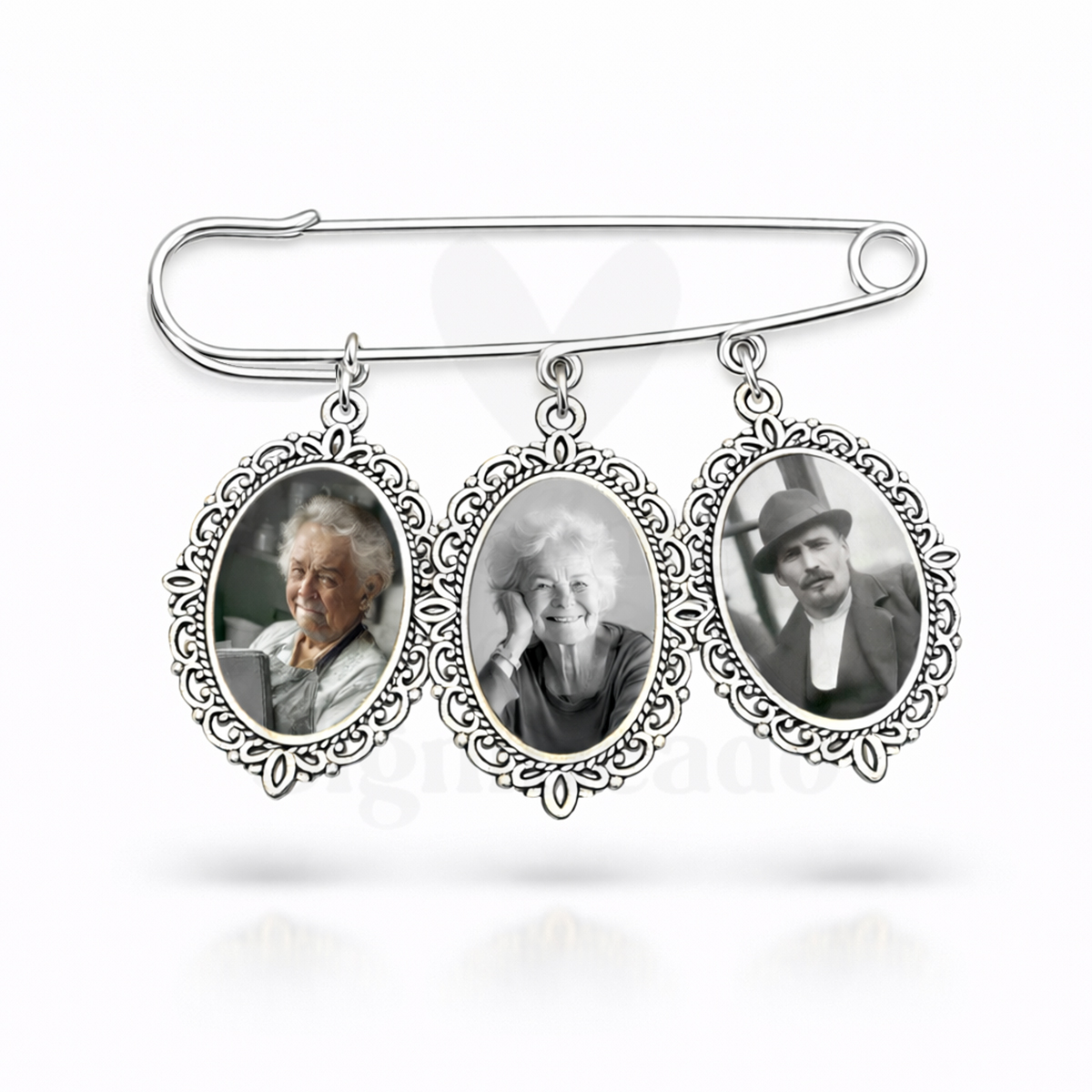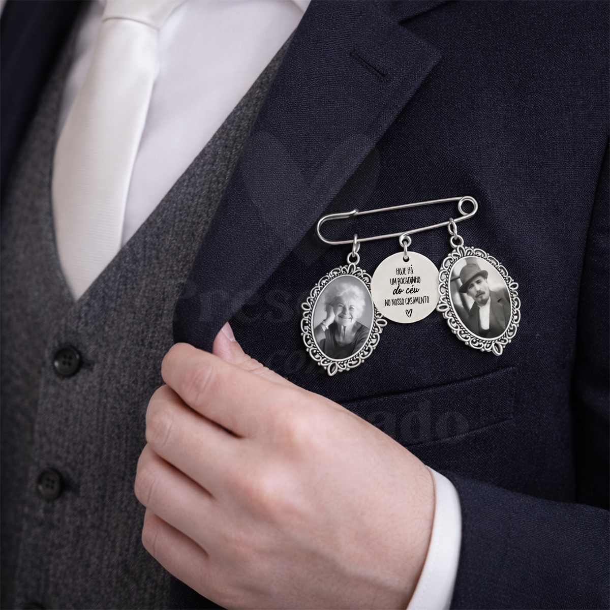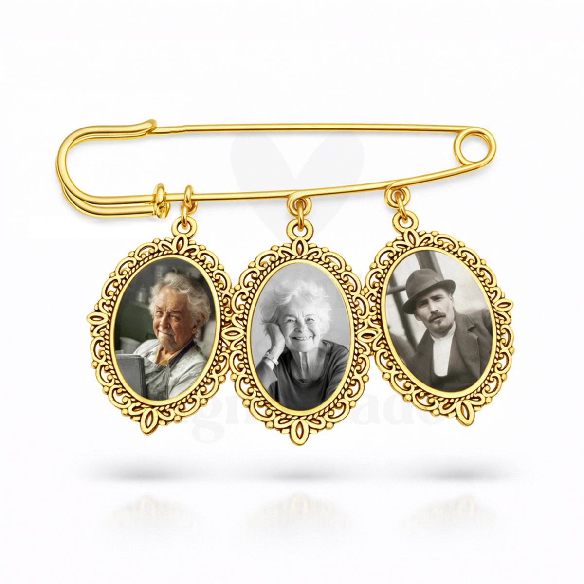 Alfinete em metal personalizado com 3 pendentes para 3 fotos. Ideal para colocar na lapela do noivo ou presa no ramo. Disponível em dourado ou prateado.