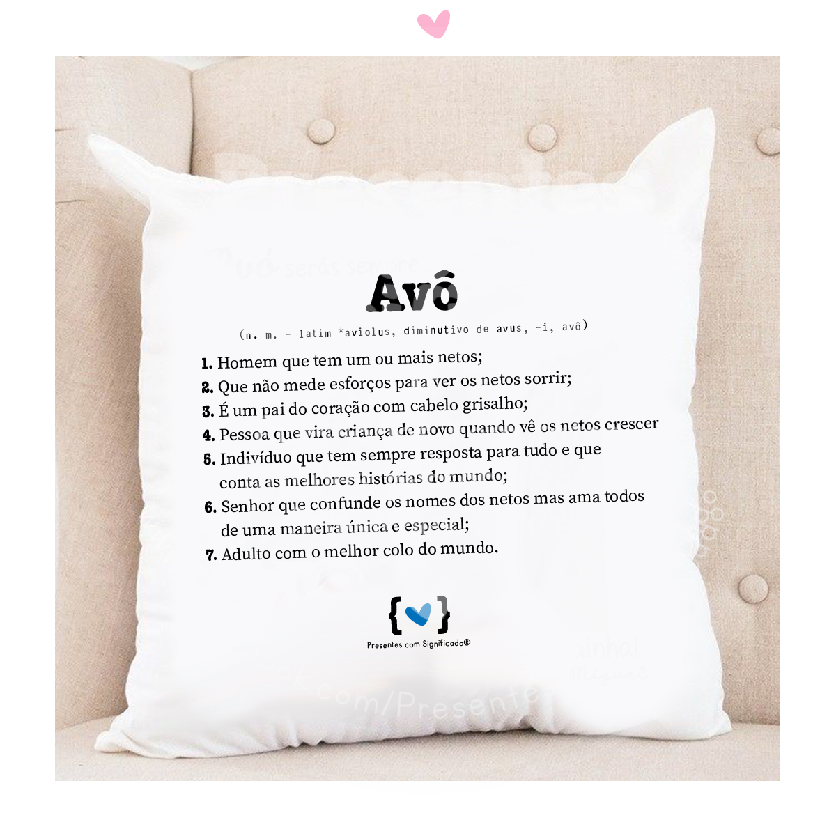 Fronha de almofada em tecido c/ texto definição de "Avô". Pode alterar as definições a seu gosto, manter igual e dicionar foto. Disponível almofada completa ou só fronha.