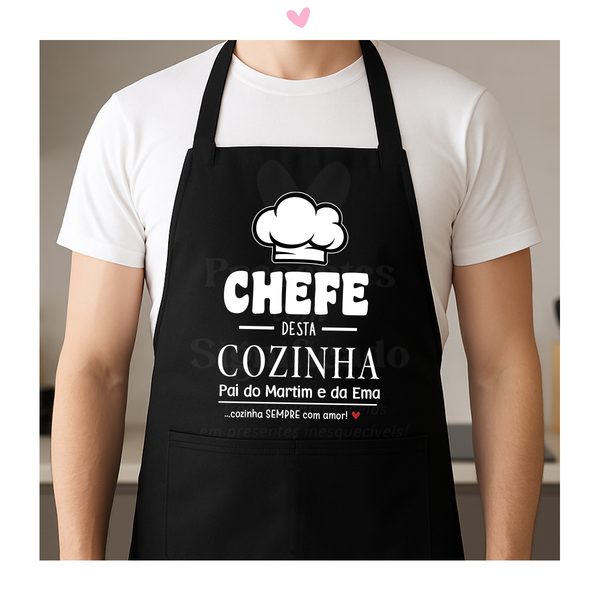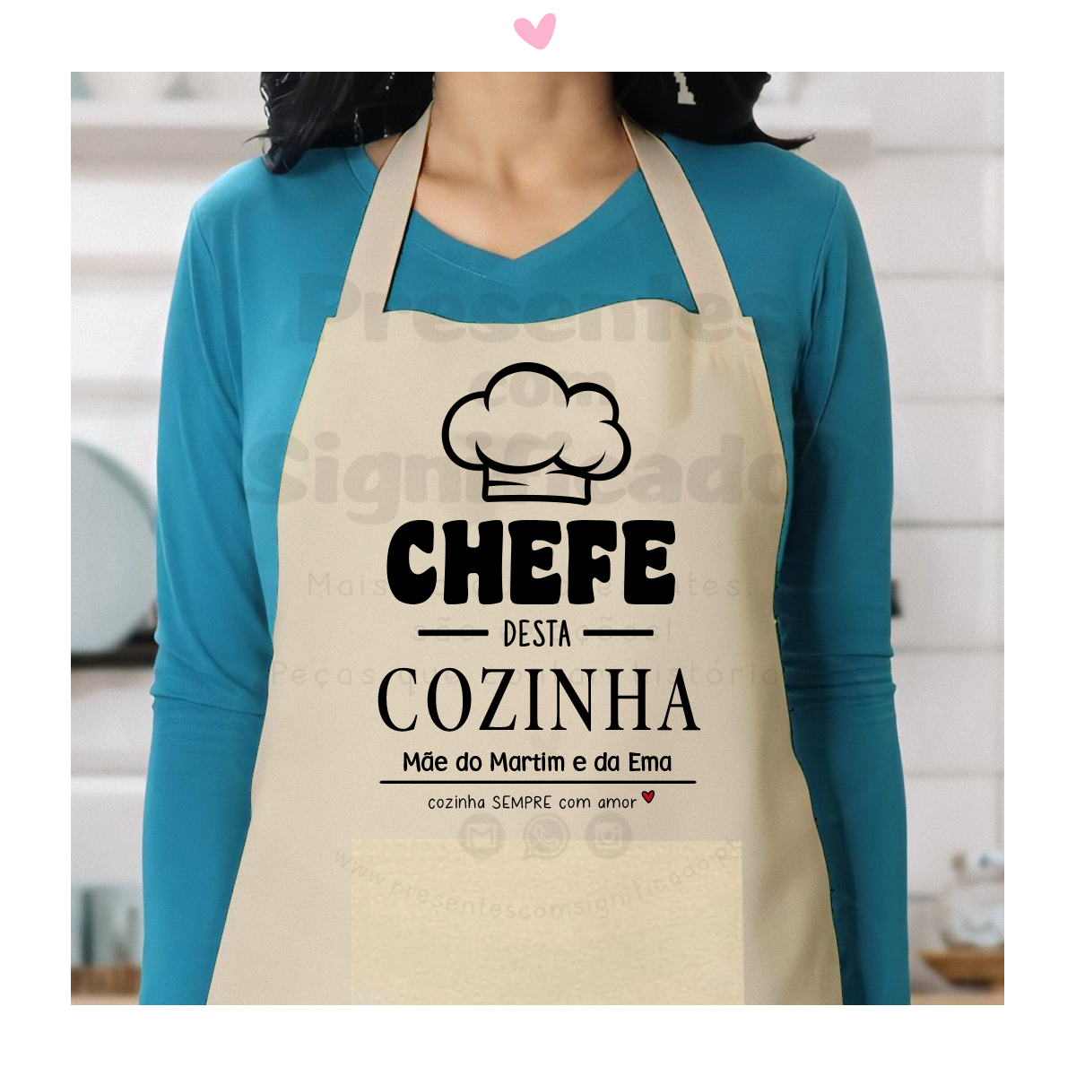 Avental feito c/ 100% algodão reciclado. Com bolso frontal e corte abaixo do joelho. Personalizado com frase "Chefe desta cozinha! Mãe do/a X... cozinha sempre com amor". Possível personalizar o texto na totalidade podendo adaptar para Avó, Pai, Madrinha....etc. Disponível em 3 cores.