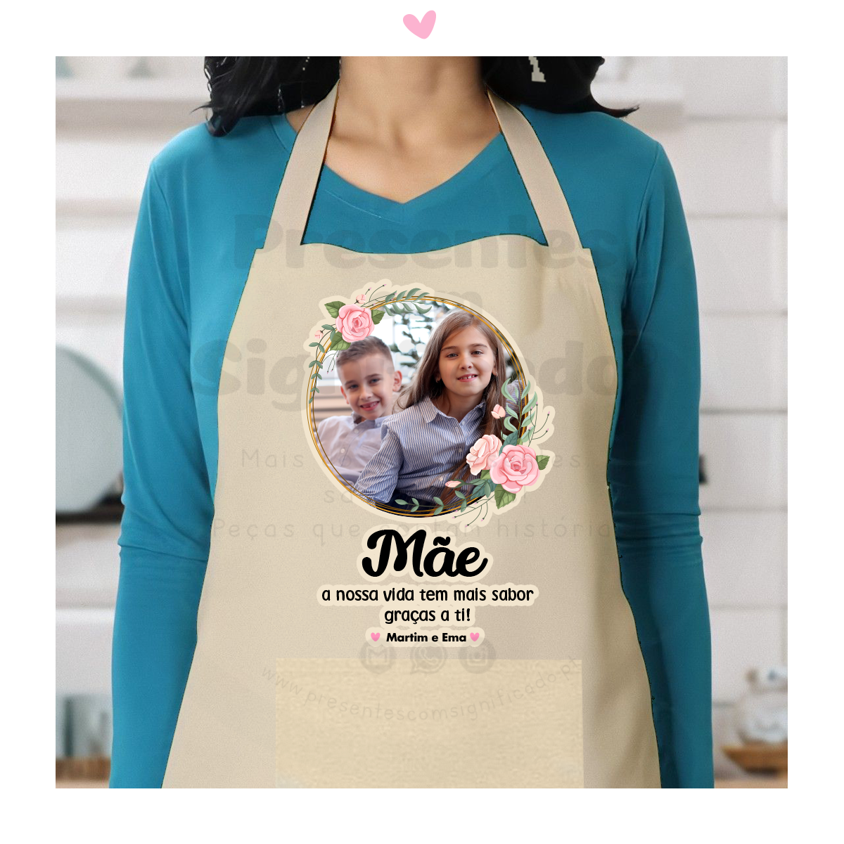 Avental feito c/ 100% algodão reciclado. Com bolso frontal e corte abaixo do joelho. Personalizado com foto e frase "Mãe, a nossa vida tem mais sabor graças a ti!". Possível personalizar a foto e texto na totalidade. Disponível em 3 cores.