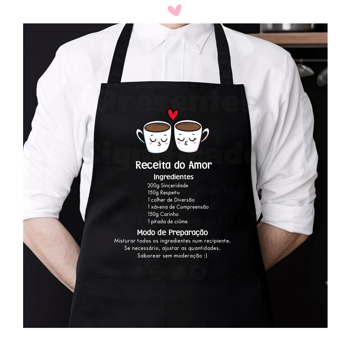 Avental em algodão e poliéster. Com bolso frontal e corte abaixo do joelho. Personalizado c/texto "Receita do amor" Possível personalizar com qualquer outro texto e/ou foto.