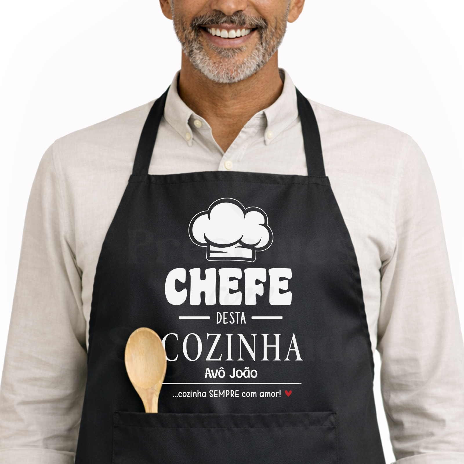 Avental personalizado com bolso frontal, fitas ajustáveis nas costas e corte abaixo do joelho. Personalizado com frase "Chefe desta cozinha! Pai do/a X... cozinha sempre com amor".