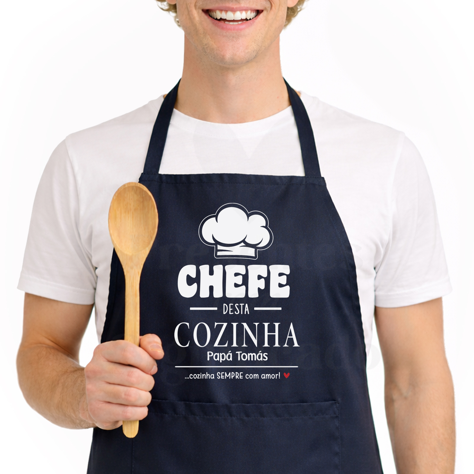 Avental personalizado com bolso frontal, fitas ajustáveis nas costas e corte abaixo do joelho. Personalizado com frase "Chefe desta cozinha! Pai do/a X... cozinha sempre com amor".