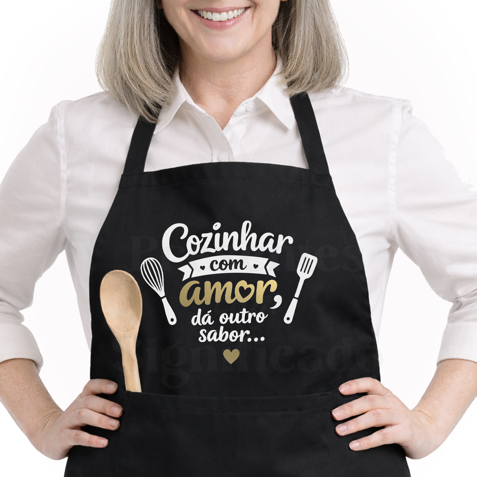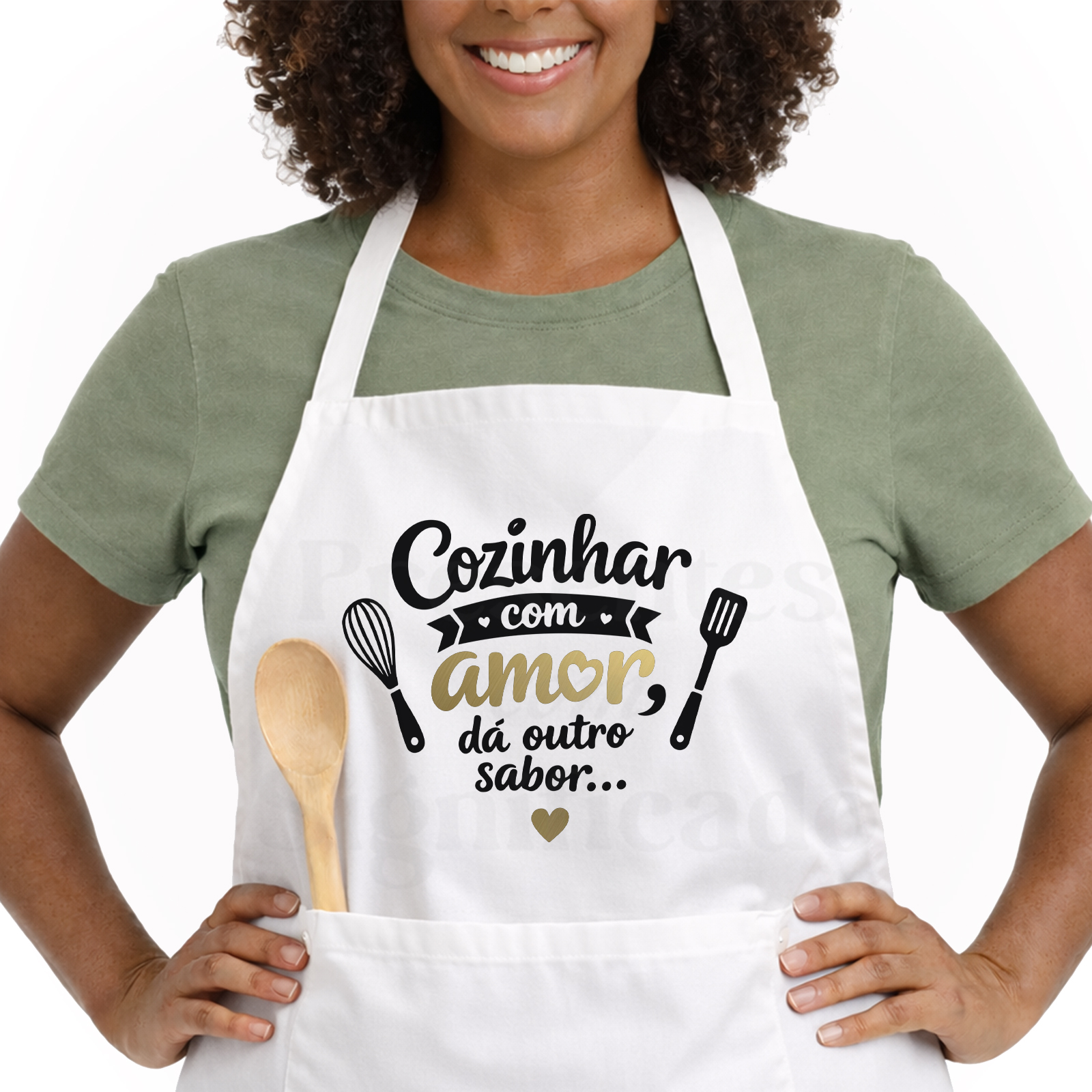 Avental personalizado com bolso frontal, fitas ajustáveis nas costas e corte abaixo do joelho. Personalizado com frase "Cozinhar com amor, dá outro sabor" com detalhes em dourado.