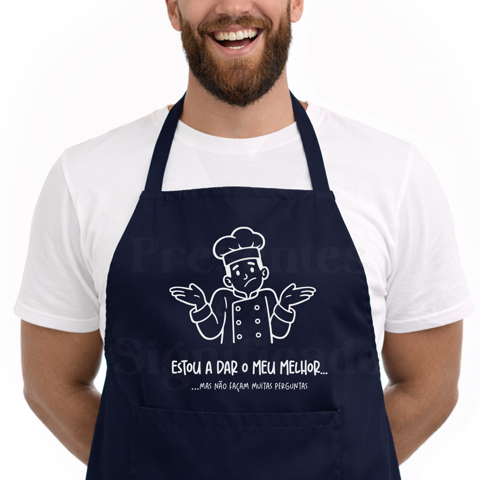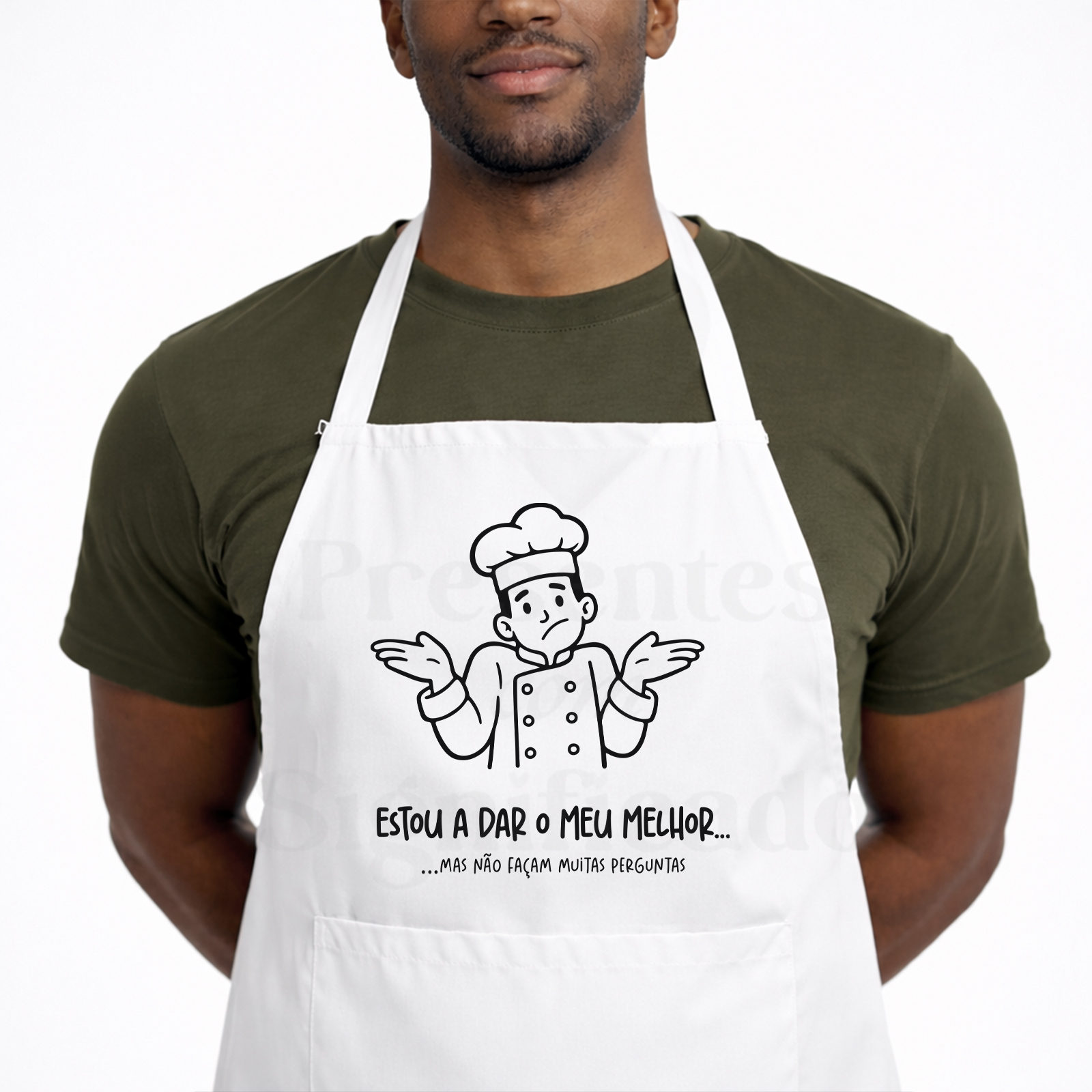 Avental personalizado com bolso frontal, fitas ajustáveis nas costas e corte abaixo do joelho. Personalizado com desenho de chef e frase " Estou a dar o meu melhor...(mas não façam muitas perguntas)".
