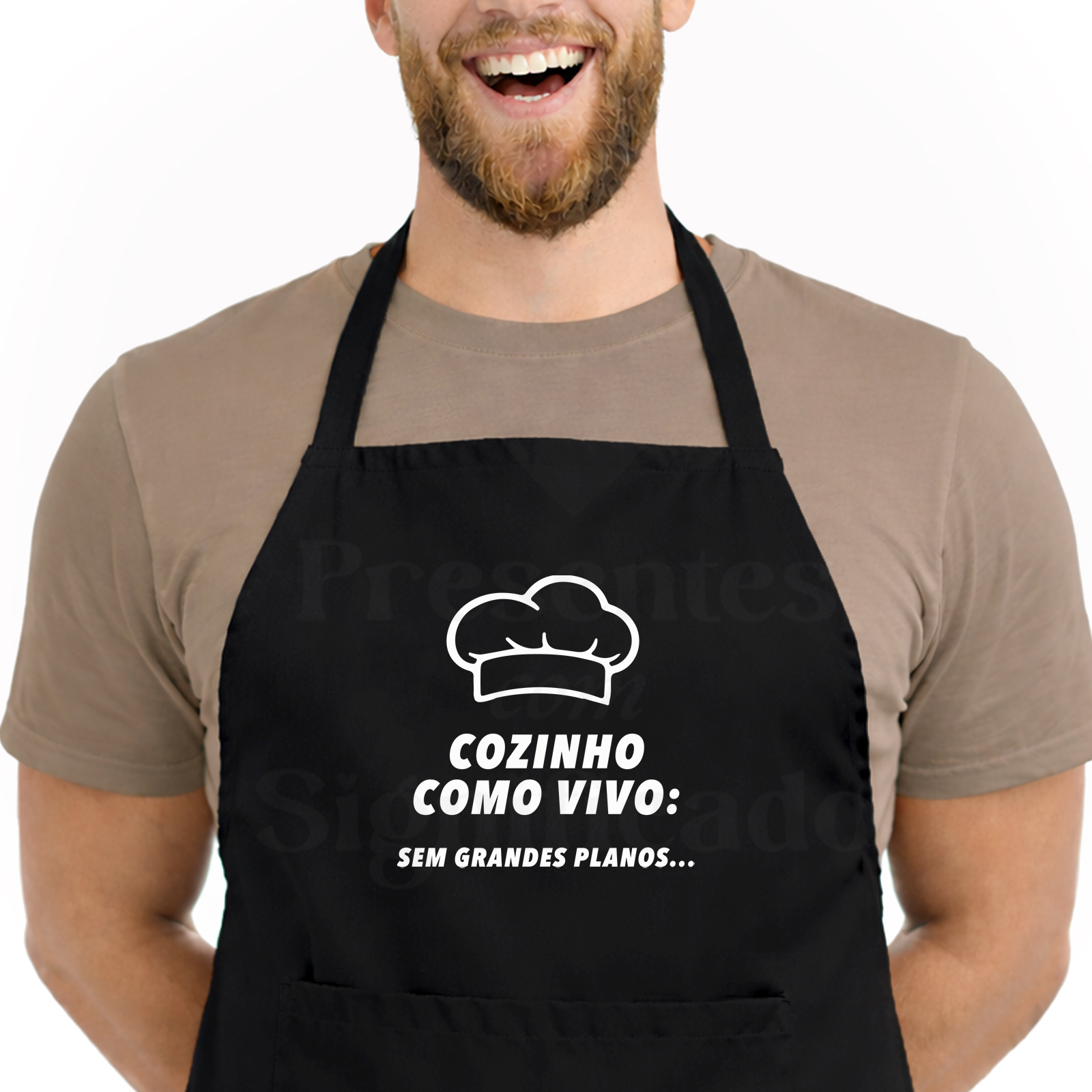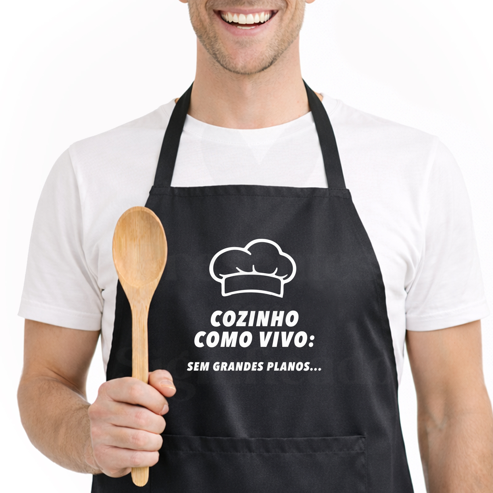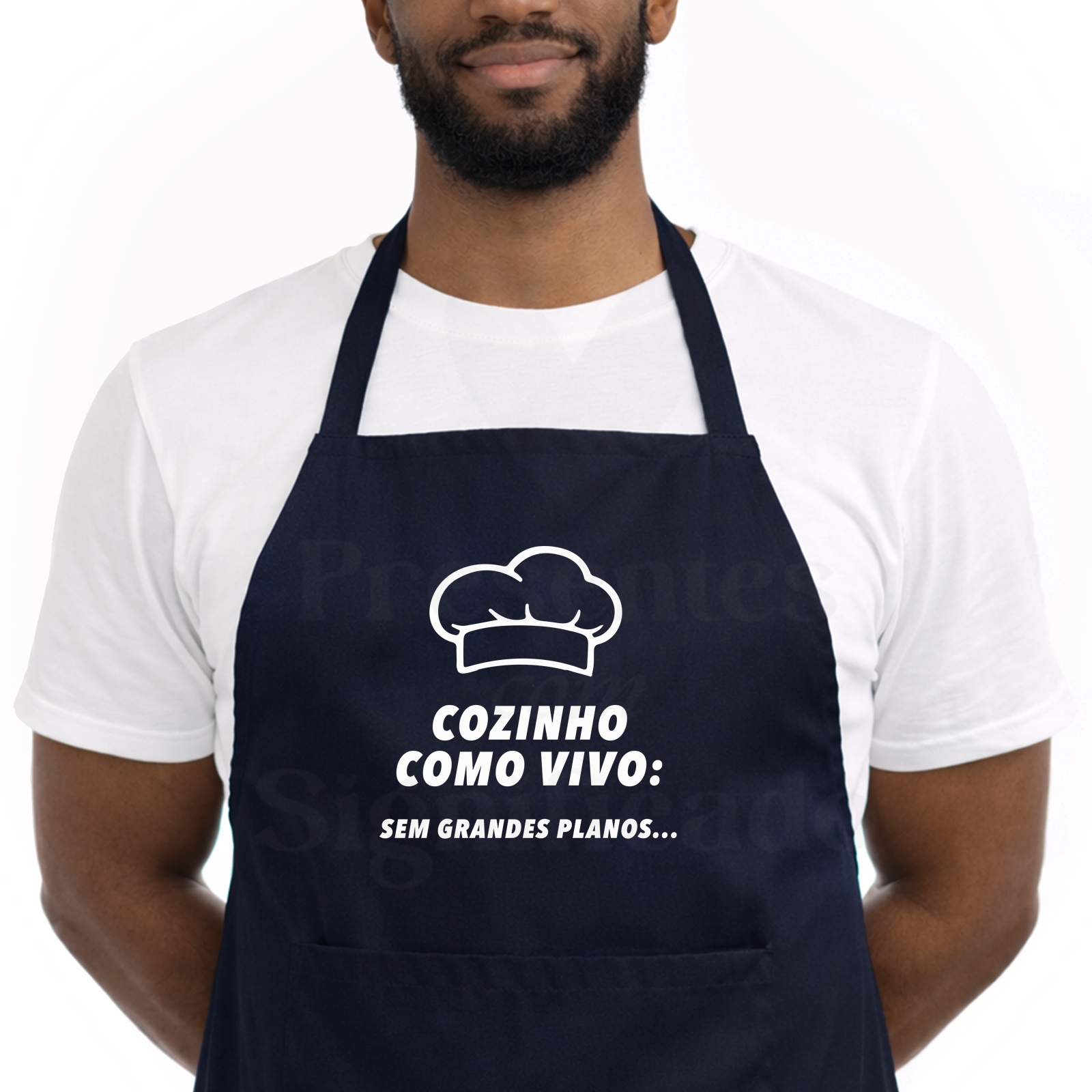 Avental personalizado com bolso frontal, fitas ajustáveis nas costas e corte abaixo do joelho. Personalizado com desenho Flork e frase "Cozinho como vivo: sem grandes planos...".