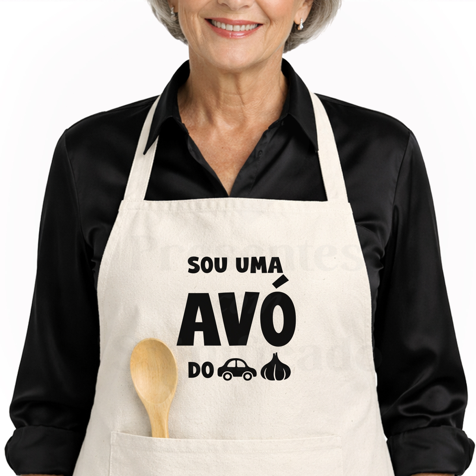 Avental personalizado com bolso frontal, fitas ajustáveis nas costas e corte abaixo do joelho. Personalizado com frase "Sou uma Avó do c*r*lho".