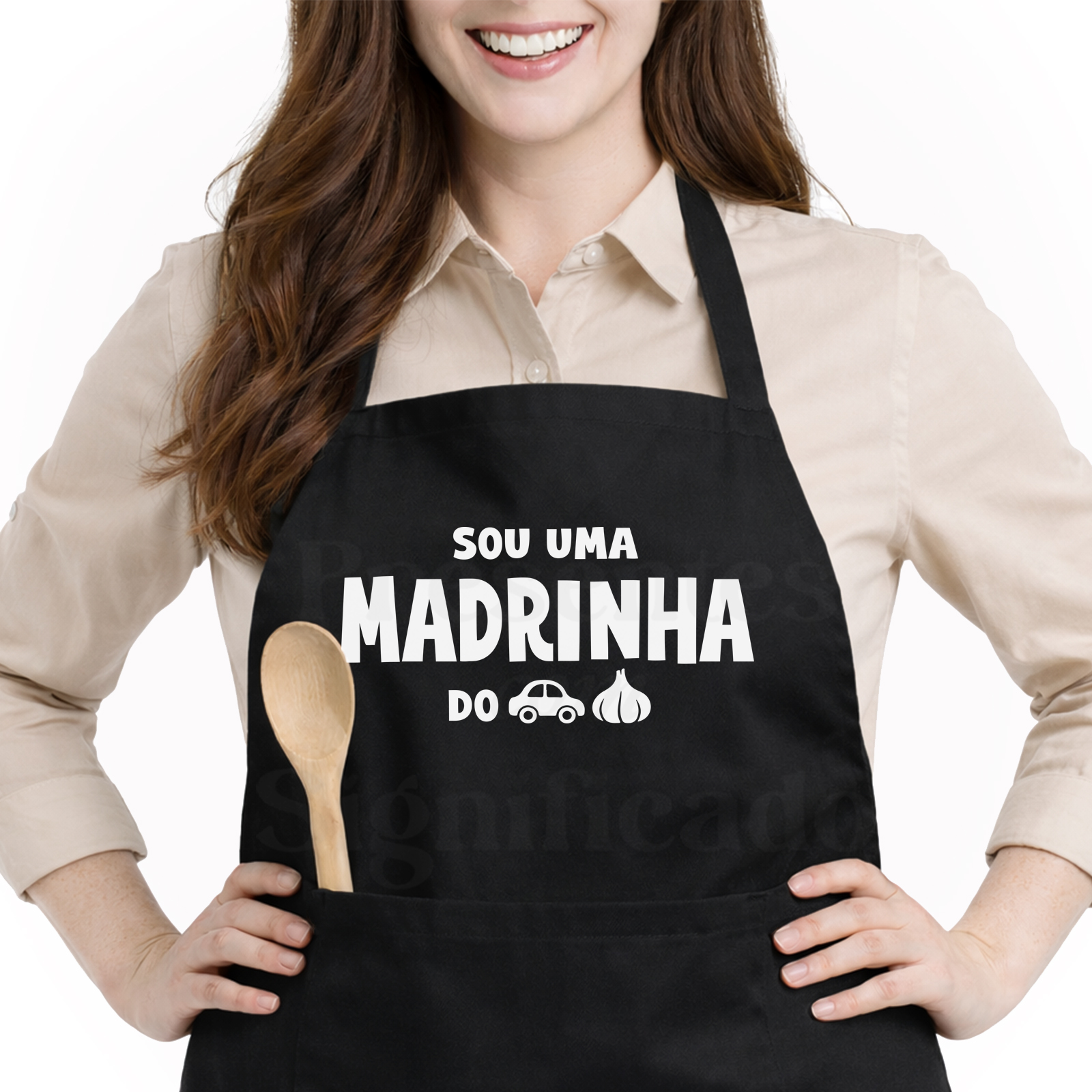Avental personalizado com bolso frontal, fitas ajustáveis nas costas e corte abaixo do joelho. Personalizado com frase "Sou uma Madrinha do c*r*lho".