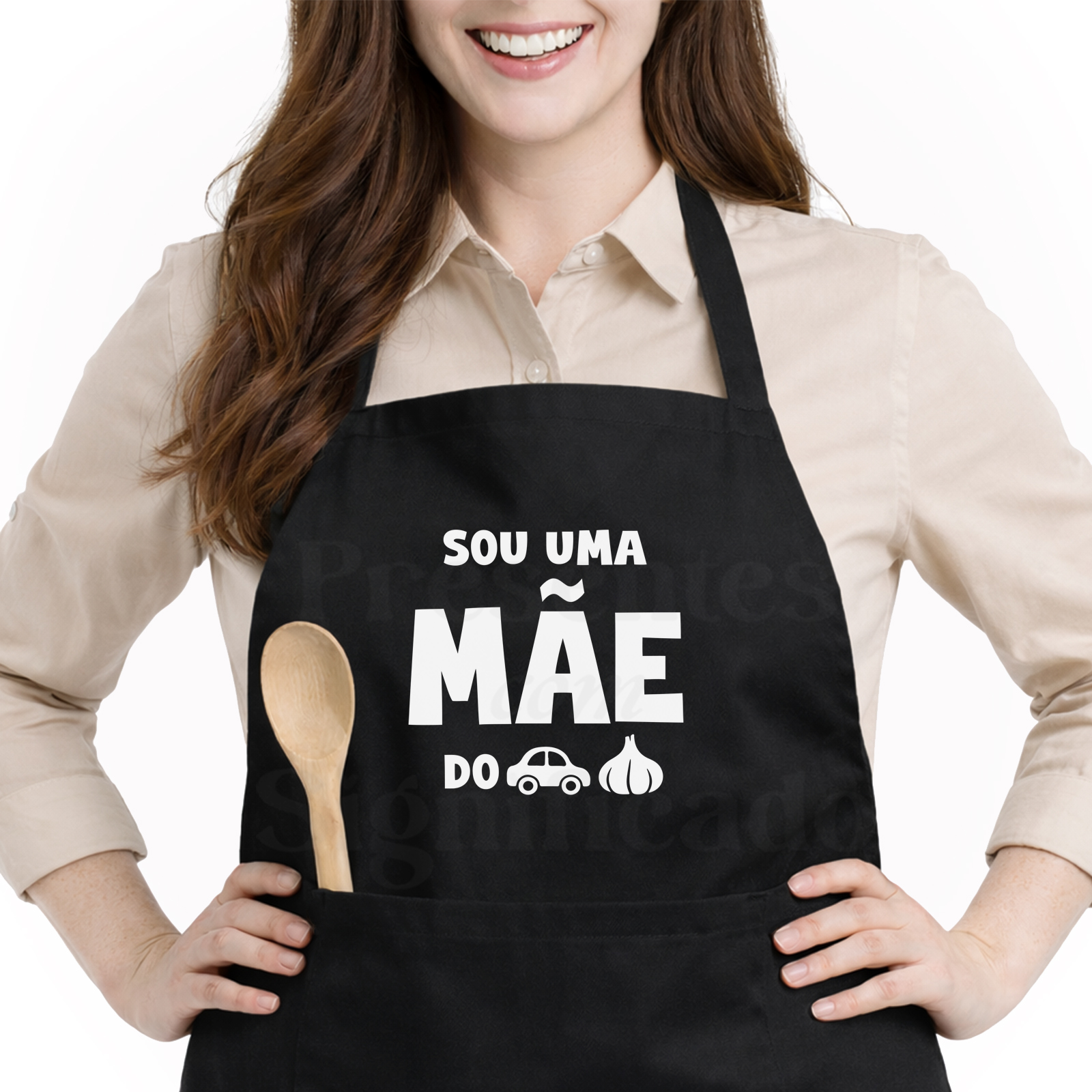 Avental personalizado com bolso frontal, fitas ajustáveis nas costas e corte abaixo do joelho. Personalizado com frase "Sou uma Mãe do c*r*lho".