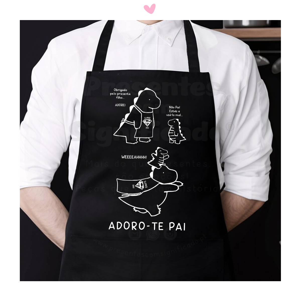 Avental feito c/ 35% Algodão/ 65% Poliéster. Com bolso frontal e corte abaixo do joelho. Personalizado com cartoon de dinossauro pai e filho e texto como no exemplo.