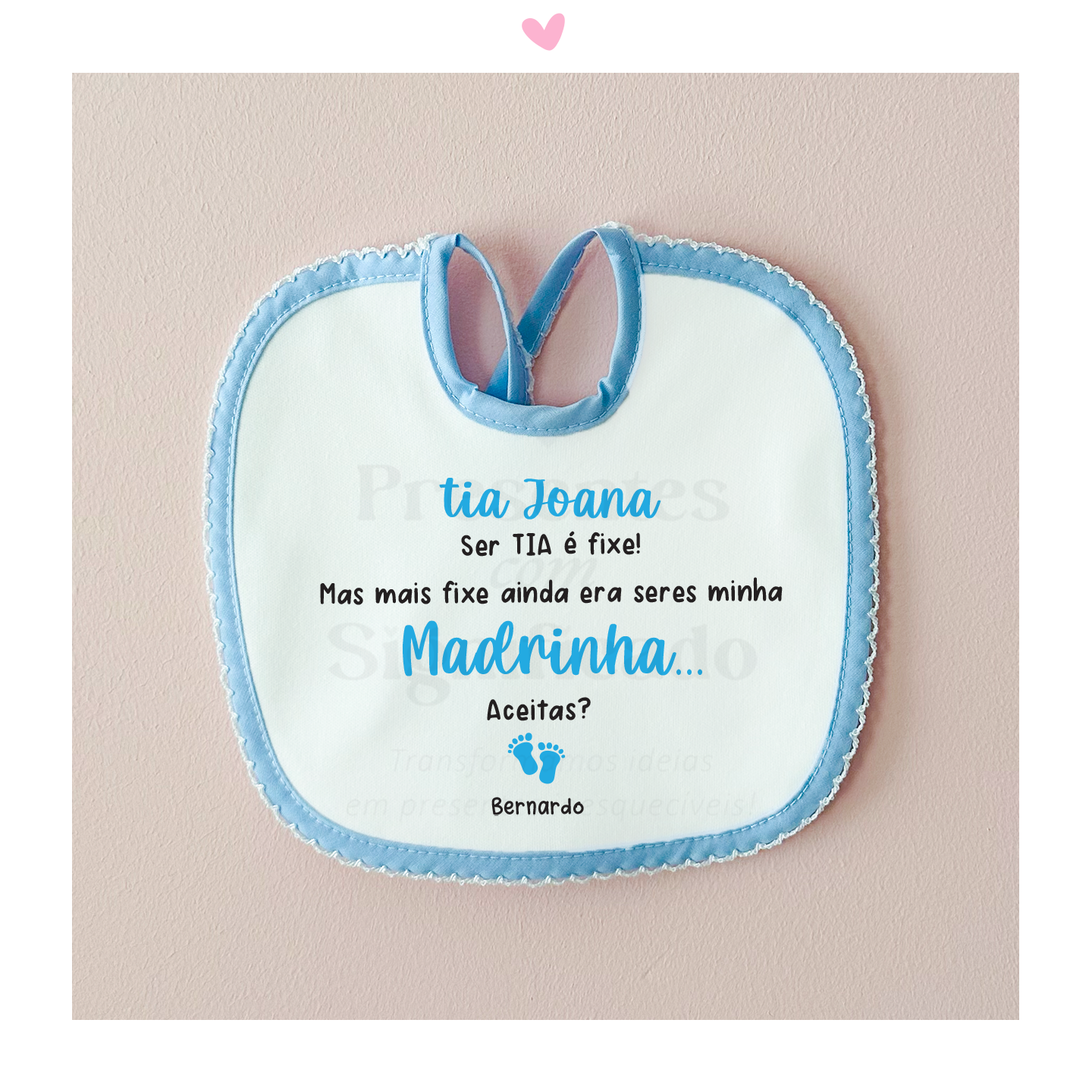 Babete em tecido duplo 100% algodão fabricado em Portugal personalizado com convite para apadrinhar. Ideal para bebé (dos 0 aos 24m). Aperta com atilhos. Disponível em 3 cores.