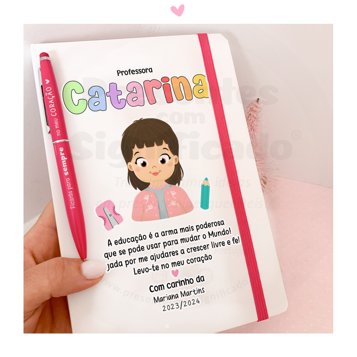 Bloco de notas formato A5 c/ 100 folhas lisas com capa branca, elástico e lombada em rosa fúcsia. Bonequinho de adulto personalizado (simboliza a professora, educadora, auxiliar...). Disponível caneta a combinar com frase personalizada.