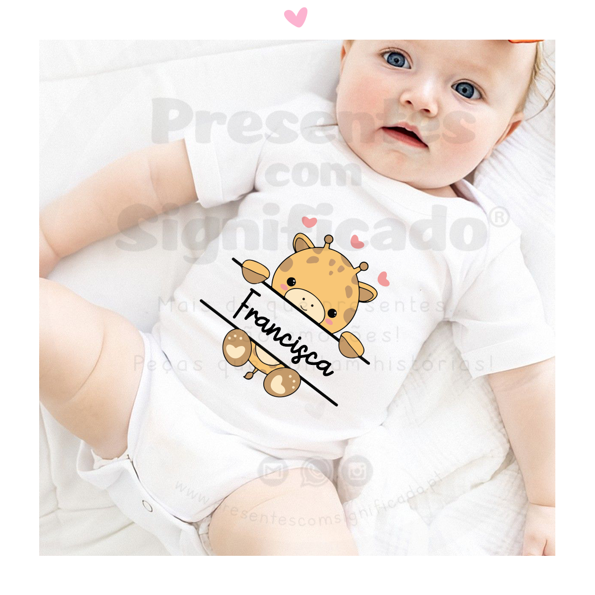 Body infantil em tecido 100% algodão personalizado com desenho fofinho de animais do Zoo + nome. Fecha com botões de pressão em baixo.