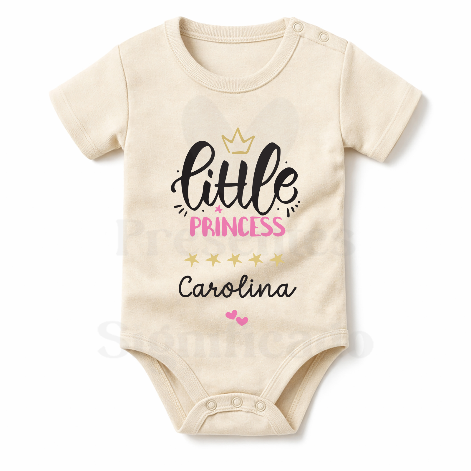 Body infantil em tecido 100% algodão personalizado com design "Little Princess" + nome. Fecha com botões de pressão em baixo.