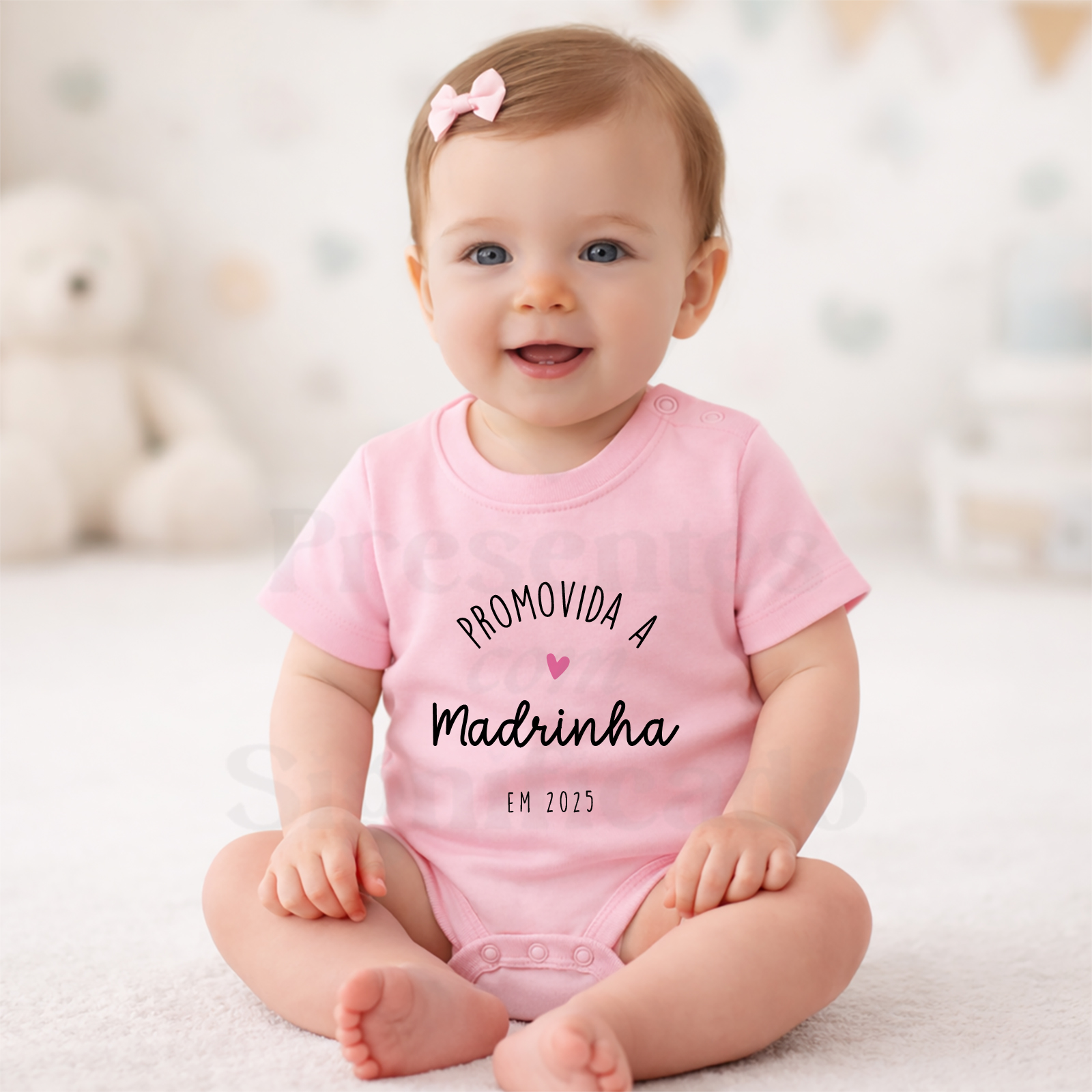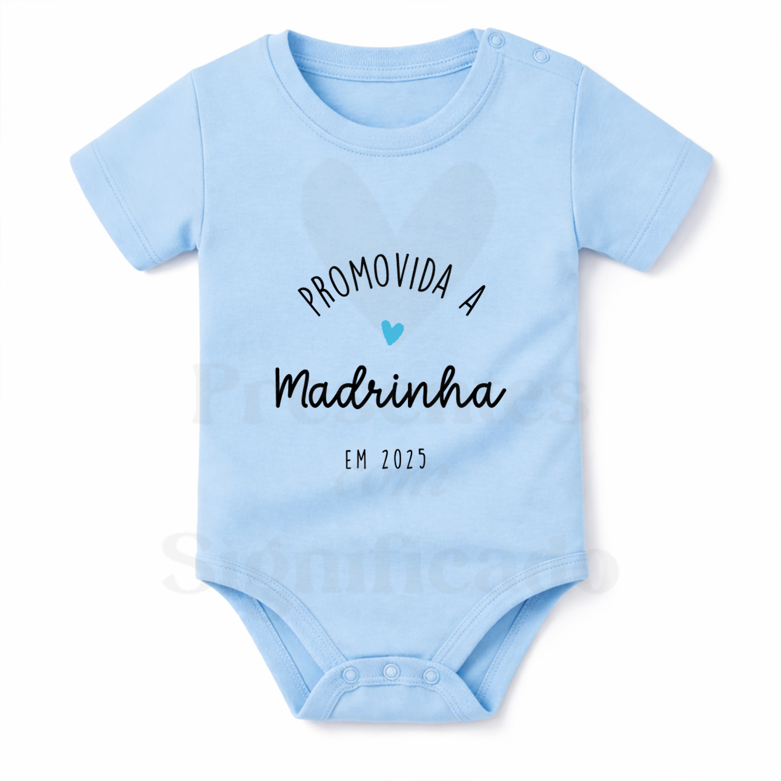 Body infantil em tecido 100% algodão personalizado com texto Promovida(o) a Madrinha/Padrinho. Pode personalizar a data final. Fecha com botões de pressão em baixo.