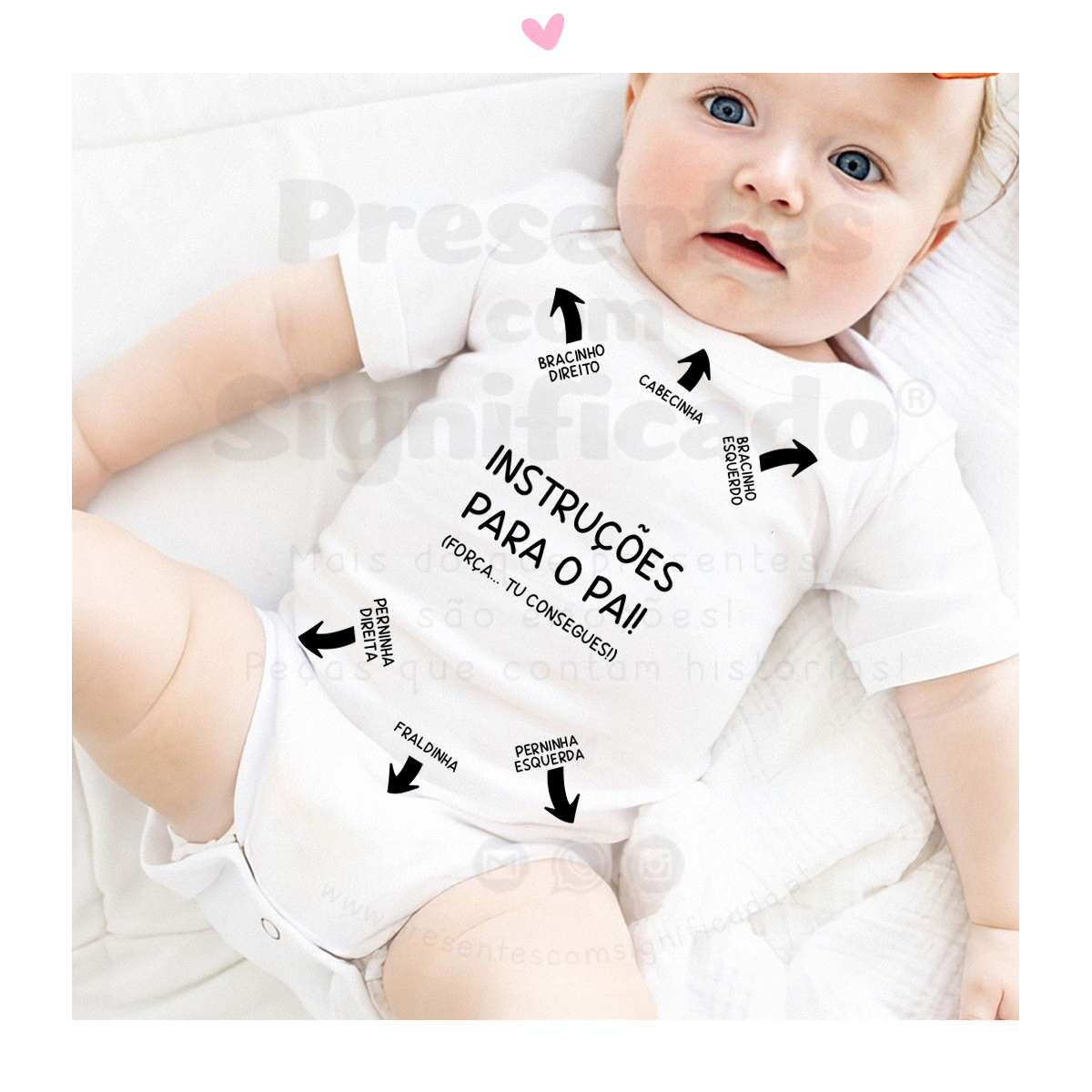 Body infantil em tecido 100% algodão personalizado com instruções para vestir o bebé. Disponível em 4 cores diferentes.