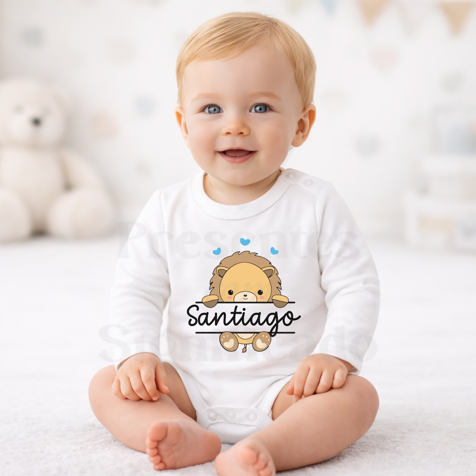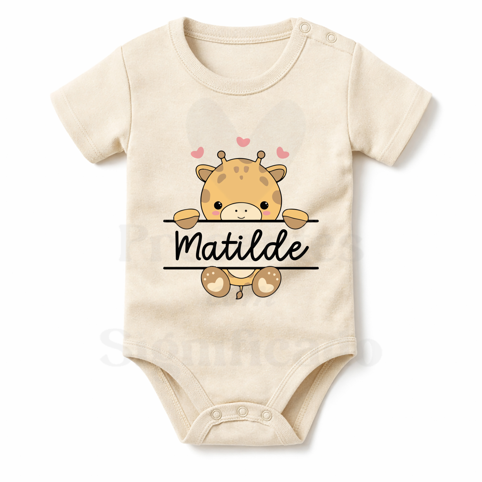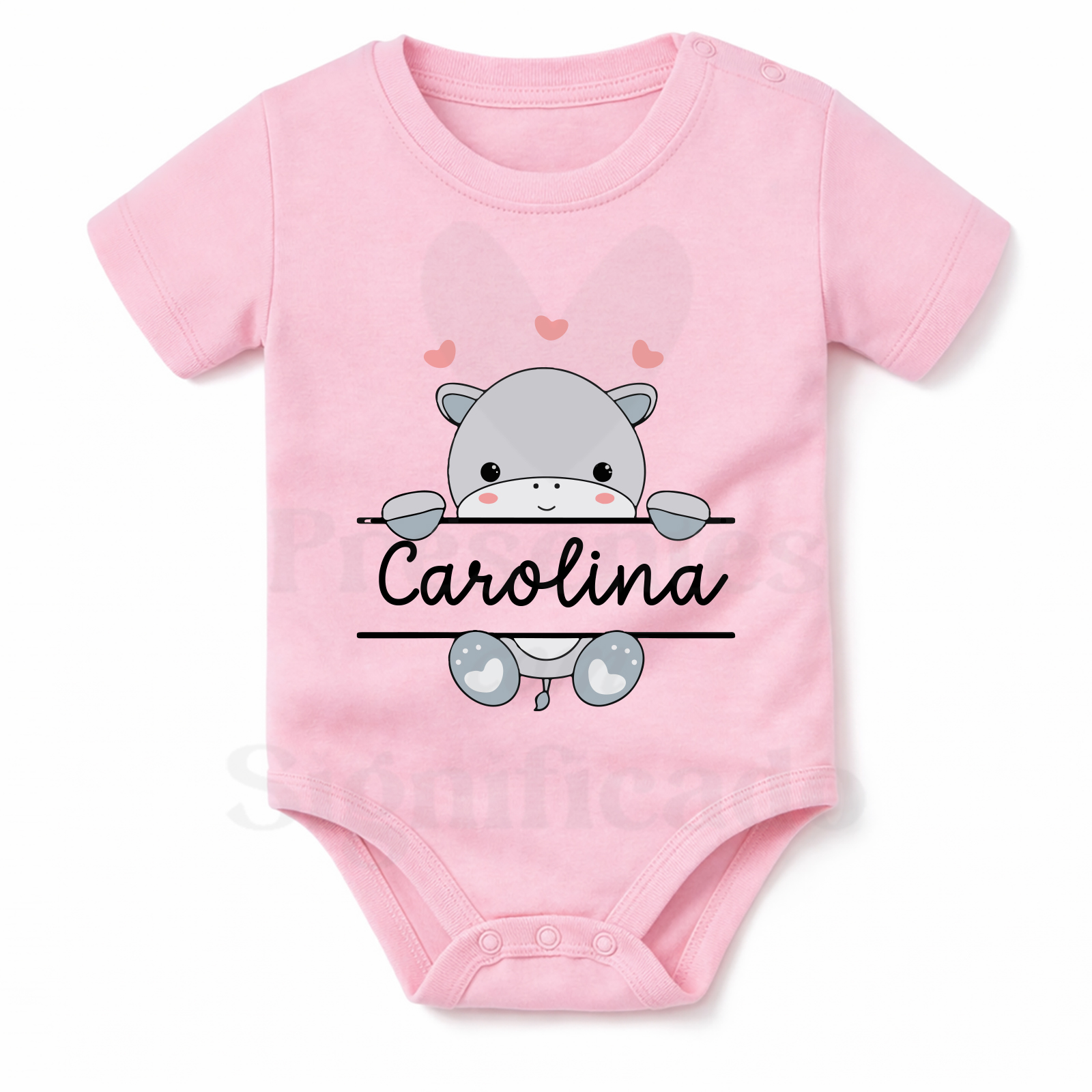 Body infantil em tecido 100% algodão personalizado com desenho fofinho de animais do Zoo + nome. Fecha com botões de pressão em baixo.
