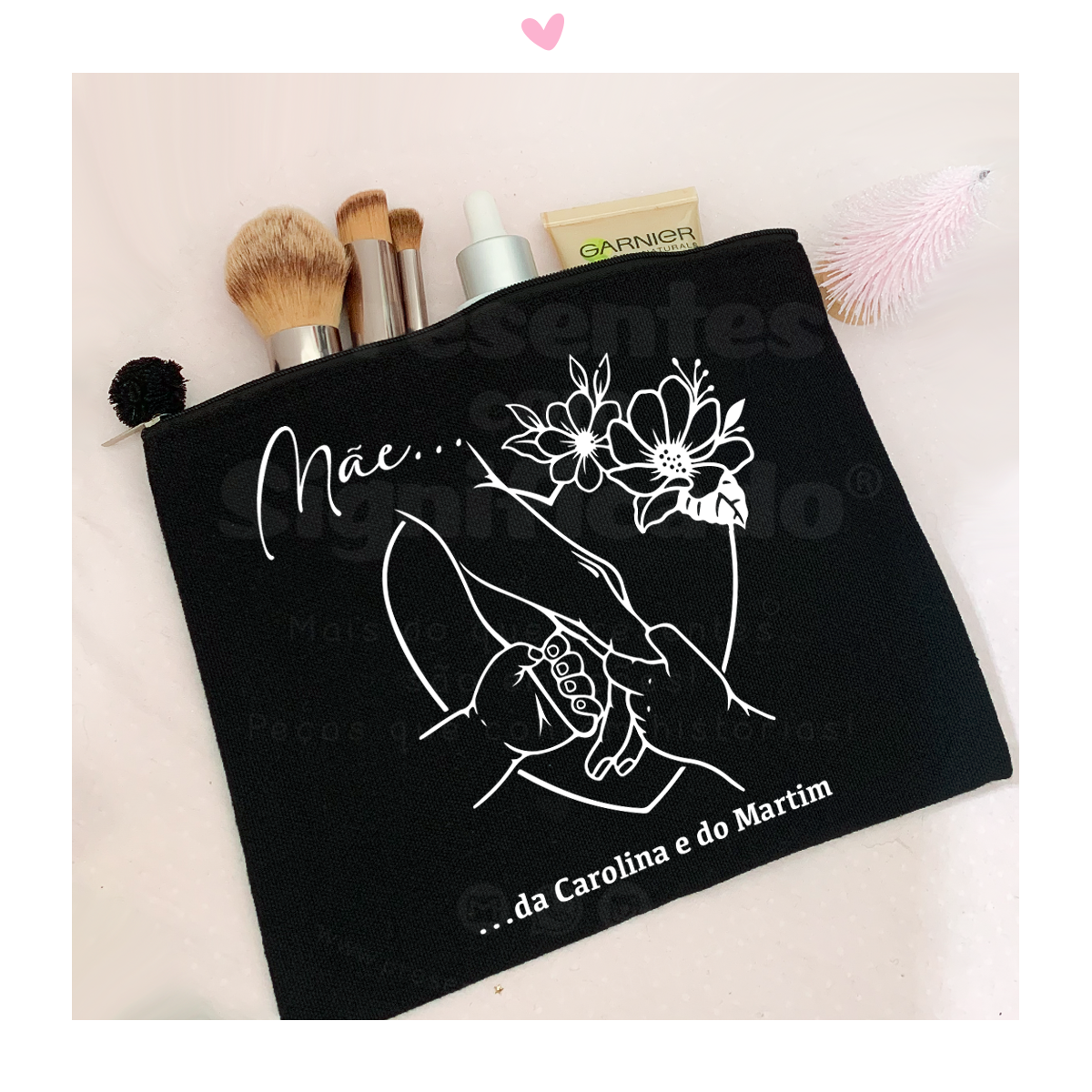 Bolsa de tecido 100% algodão e fecho em nylon. Tamanho ideal para ser usada como necessaire. Pode personalizar com o texto a seu gosto.