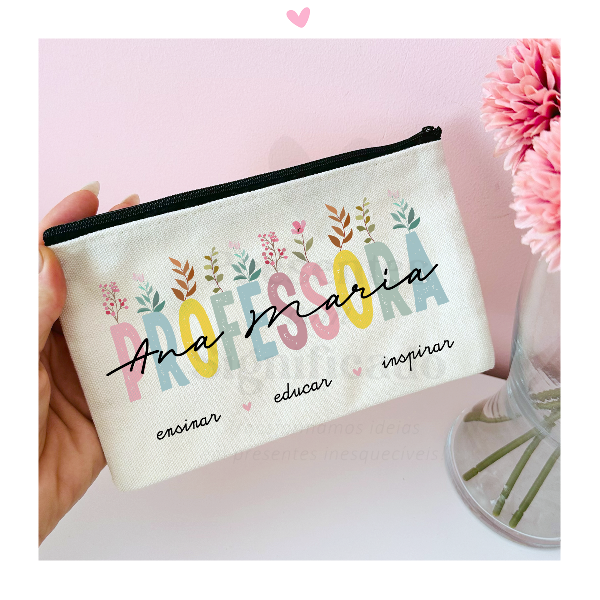 Bolsa de tecido em algodão e poliester e fecho em nylon preto. Tamanho ideal para ser usada tanto como estojo escolar como necessaire. Pode personalizar com o texto a seu gosto.