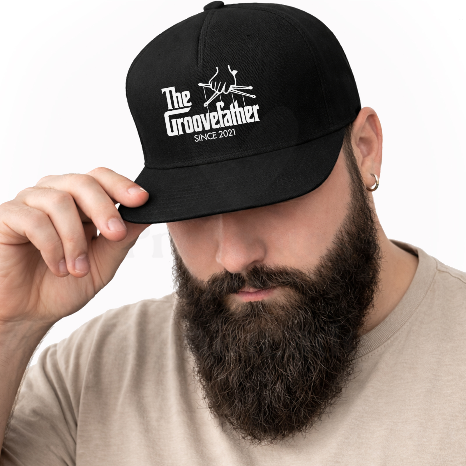 Boné adulto preto estilo "cap" (modelo snapback) de pala direita, regulável atrás (com fecho em PVC) e tecido de 300g. Personalizado com desenho de baquetas de bateria e texto "The Groovefather since..."