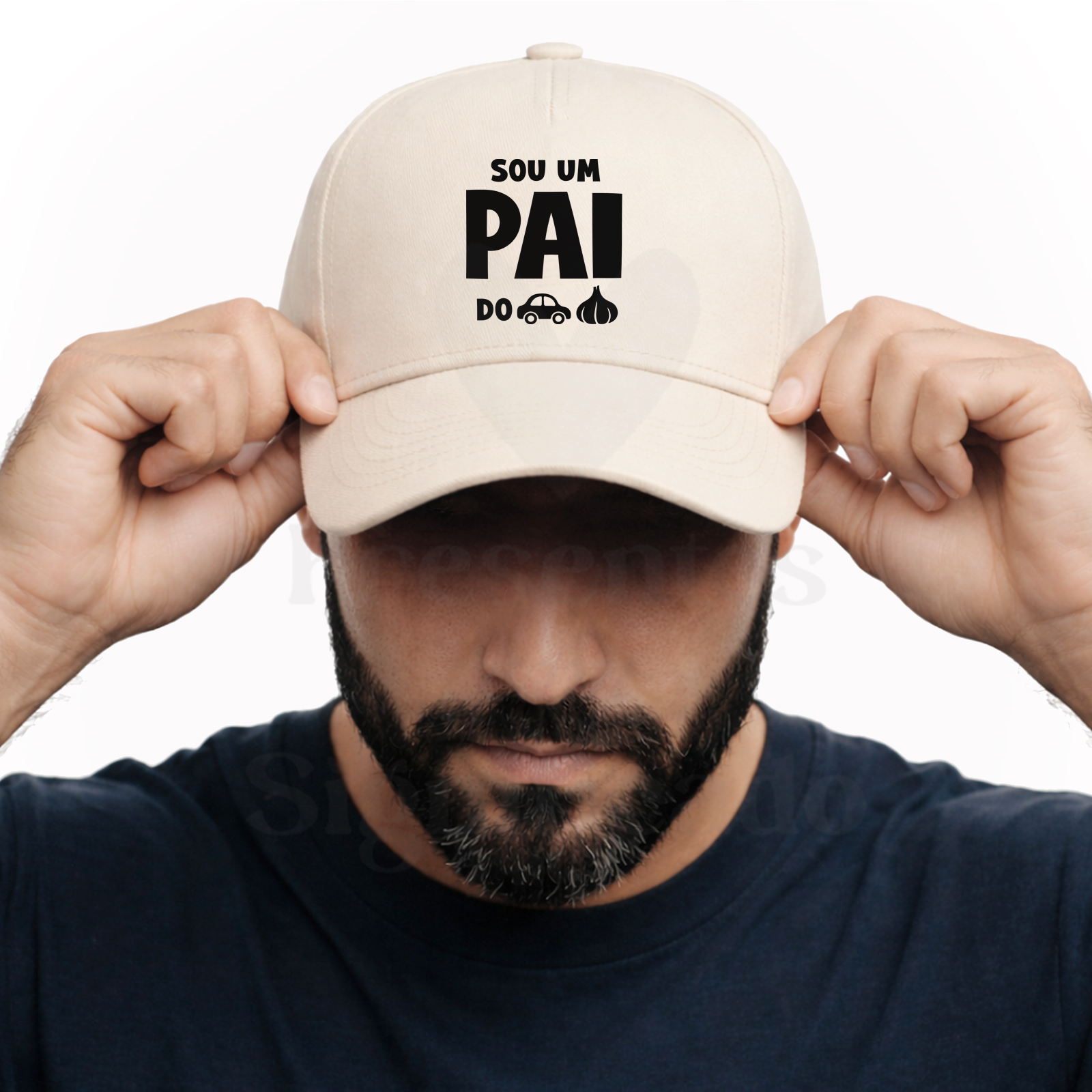 Boné de adulto de 5 painéis em algodão orgânico de acabamento macio. Com fecho ajustável de fivela e orifícios de ventilação bordados, personalizado com texto "Sou um Pai do c*r*lho".