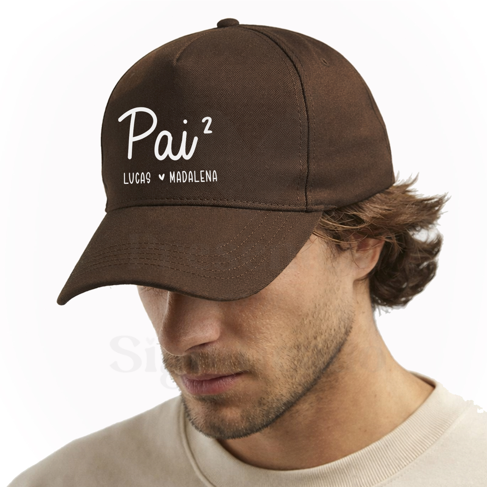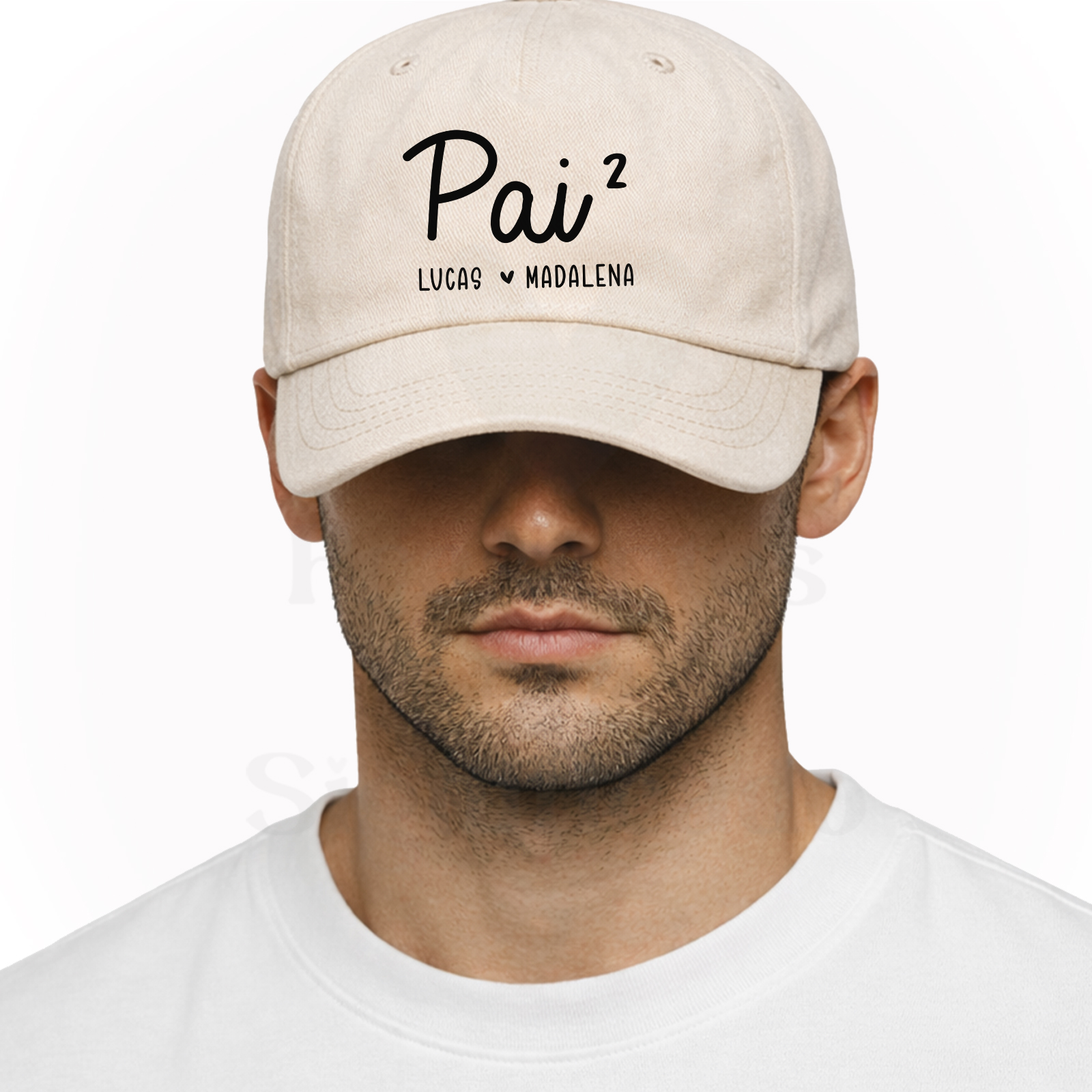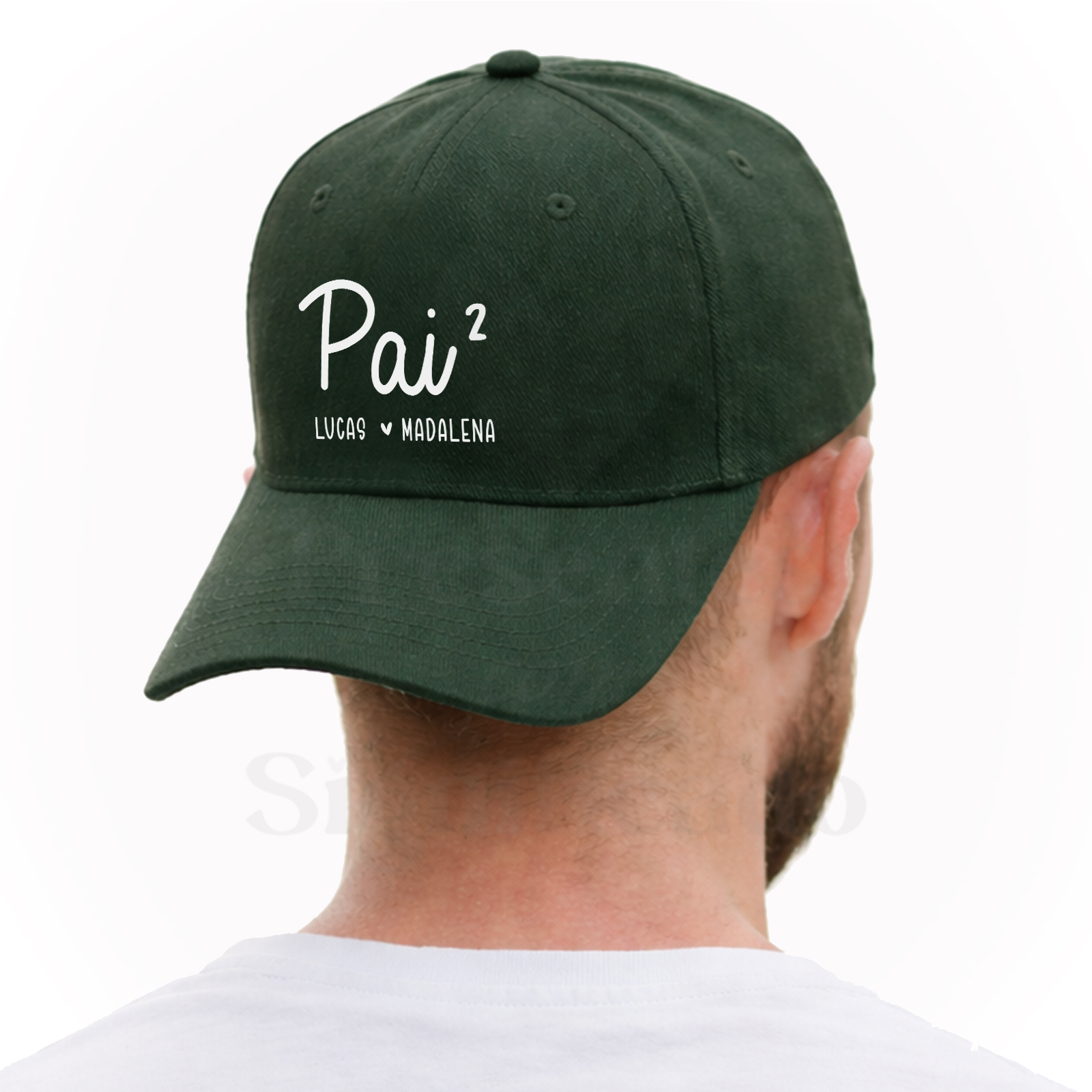 Boné de adulto de 5 painéis em algodão orgânico de acabamento macio. Com fecho ajustável de fivela e orifícios de ventilação bordados, personalizado com texto "Pai² ou Pai³" (pai ao quadrado, pai ao cubo - com nomes).