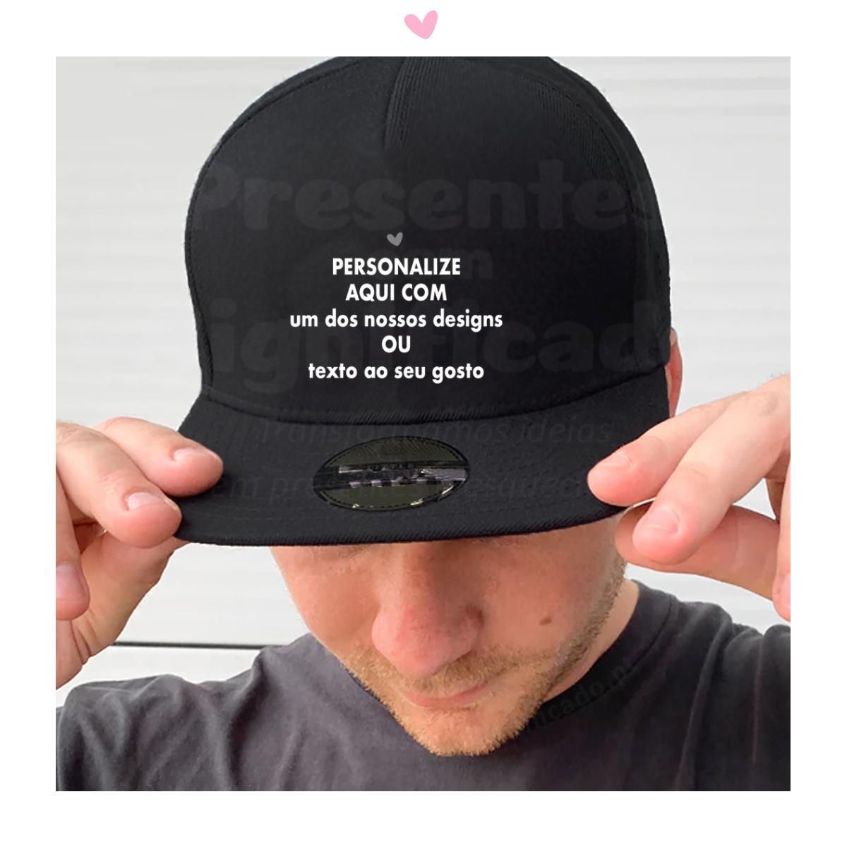 Boné adulto preto regulável atrás. Personalizado com o texto que quiser. Podemos colocar pequenos emojis (sem cor).