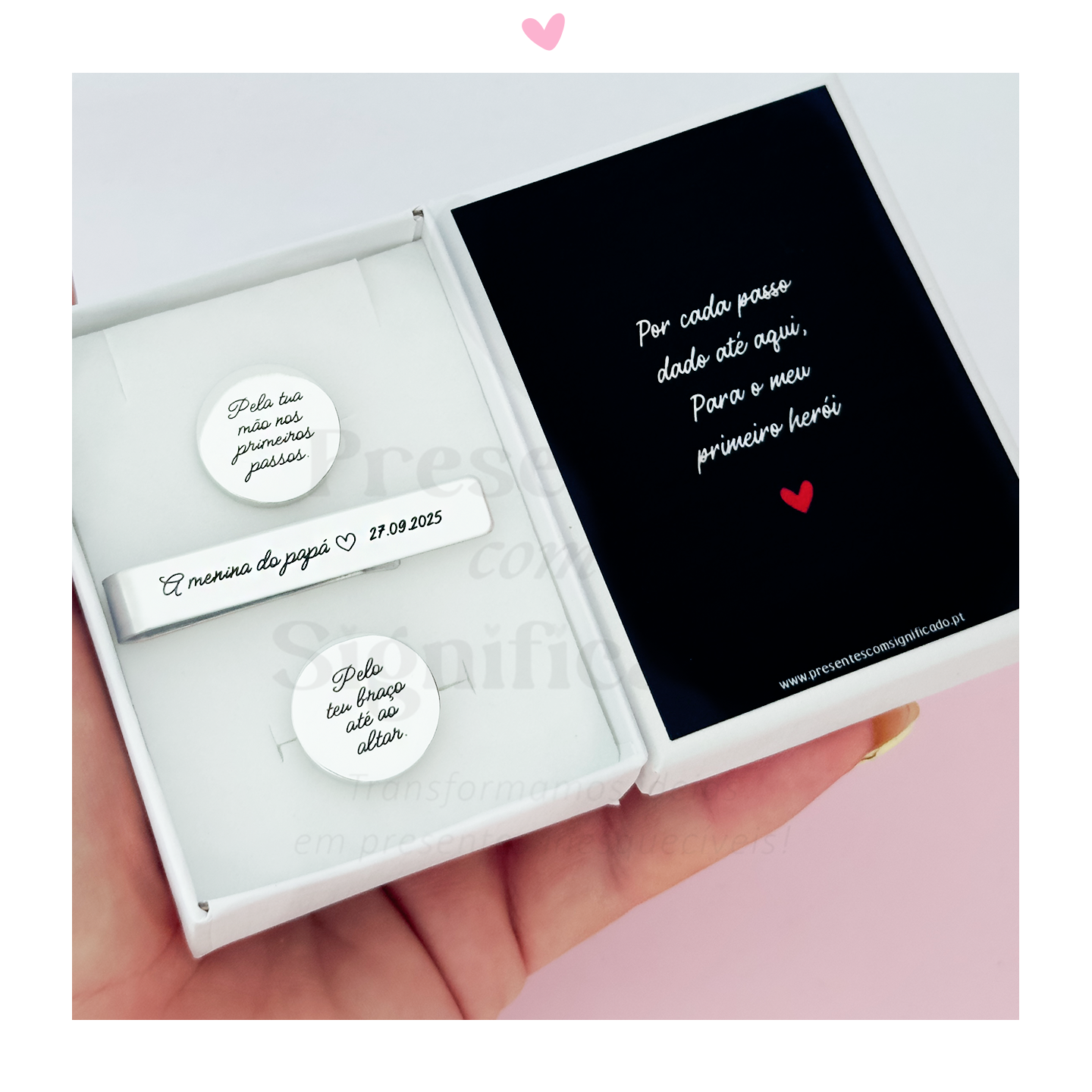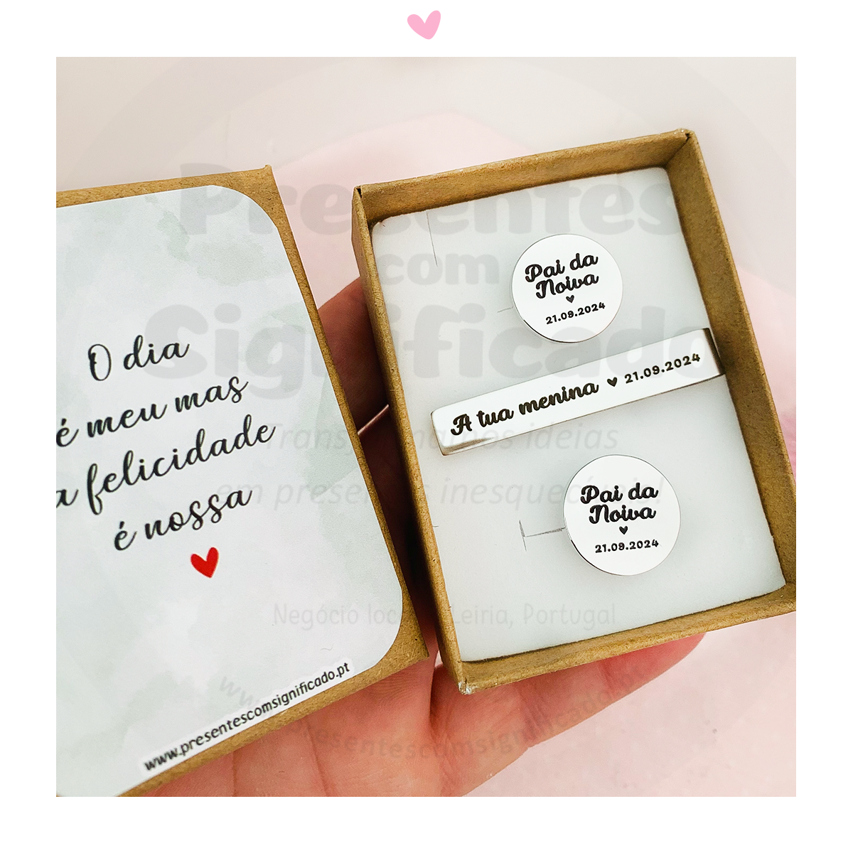 Par de botões de punho (3mm grossura) c/ gravação personalizada. Pode adicionar, como complemento, o prendedor de gravata em aço (também com gravação).