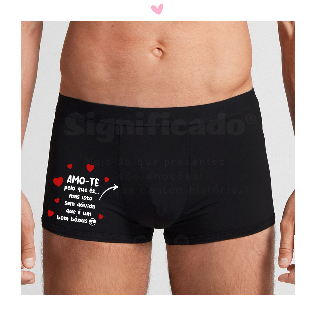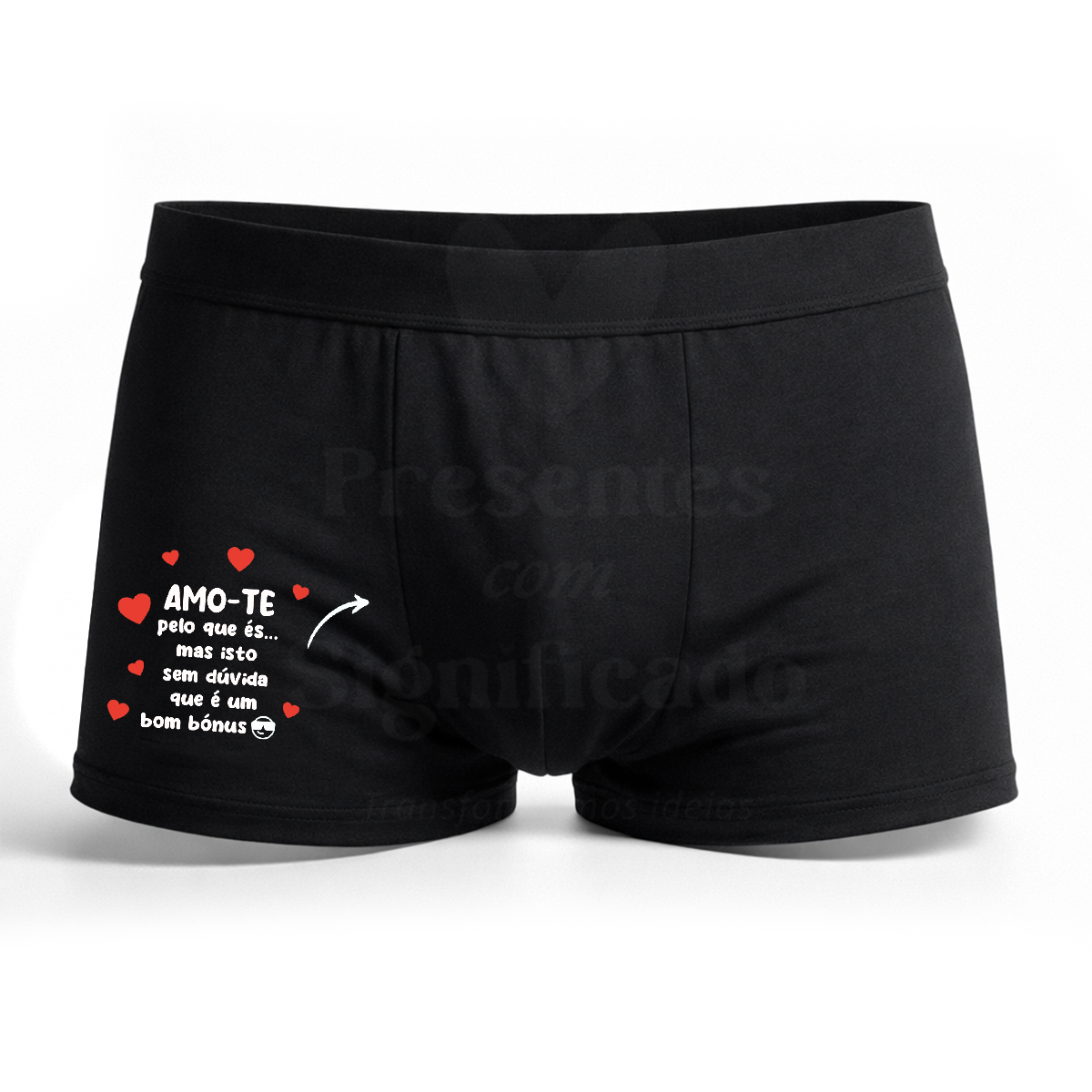 Boxers pretos masculinos personalizados com frase "Amo-te pelo que és... mas isto sem dúvida que é um bom bónus!". Modelo justo, com elástico na cintura e tecido respirável e confortável.