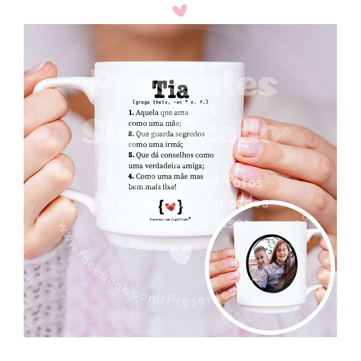 Caneca de cerâmica personalizada com definição de "Tia". Possível fazer só com texto ou acrescentar foto.