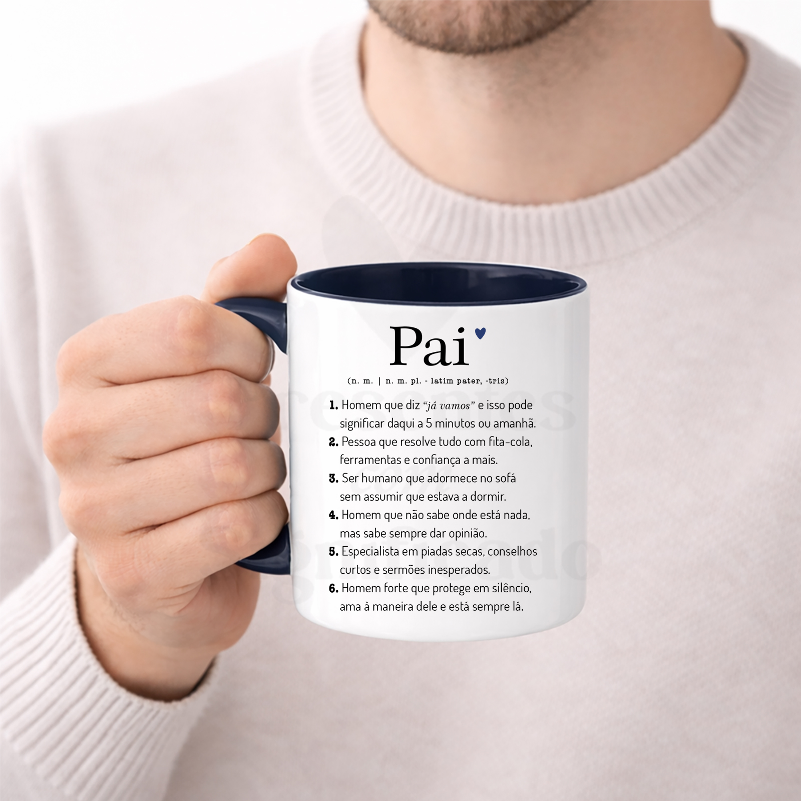 Caneca de cerâmica personalizada com definição de "Pai". Possível alterar um ou mais pontos, fazer só com texto ou acrescentar foto nas costas.
