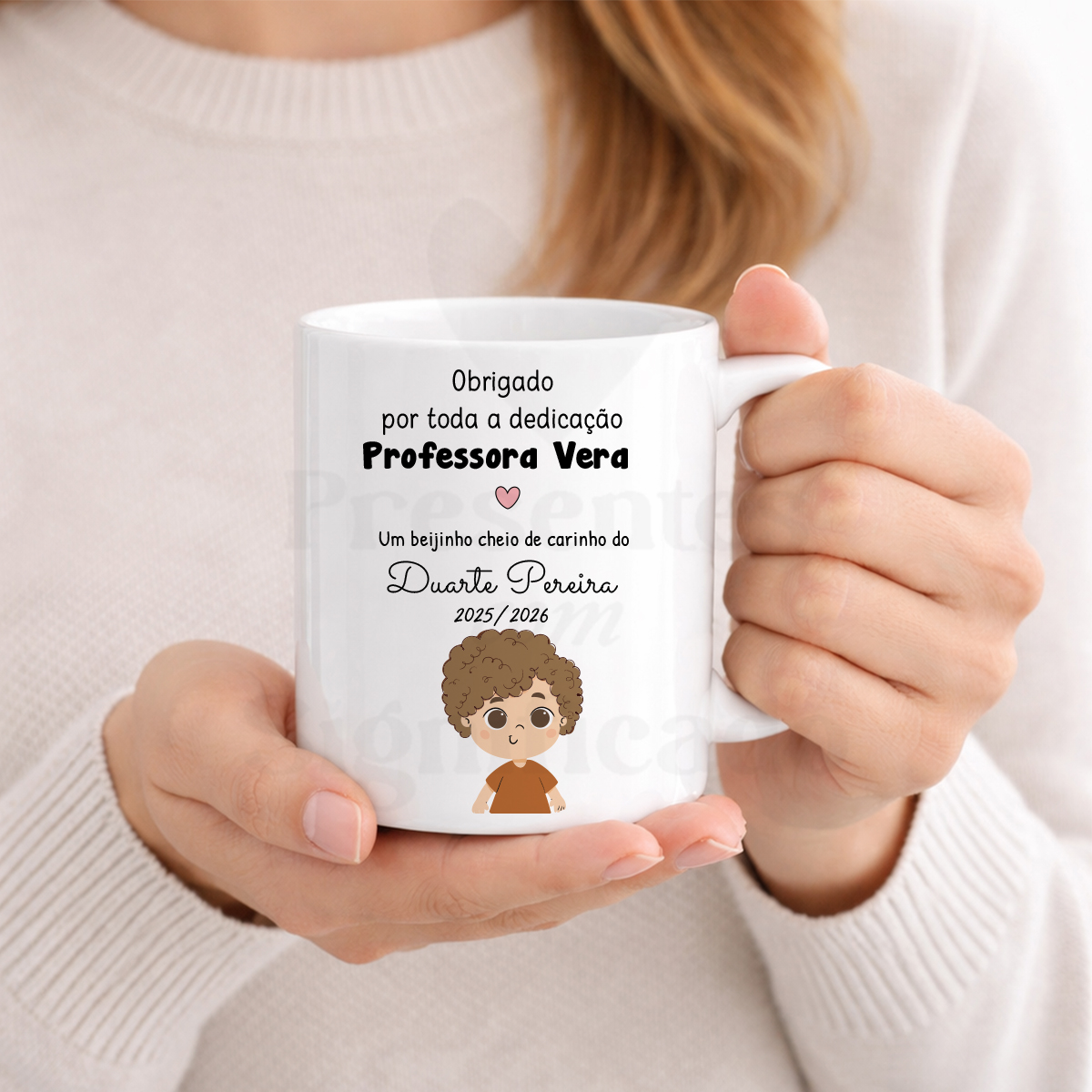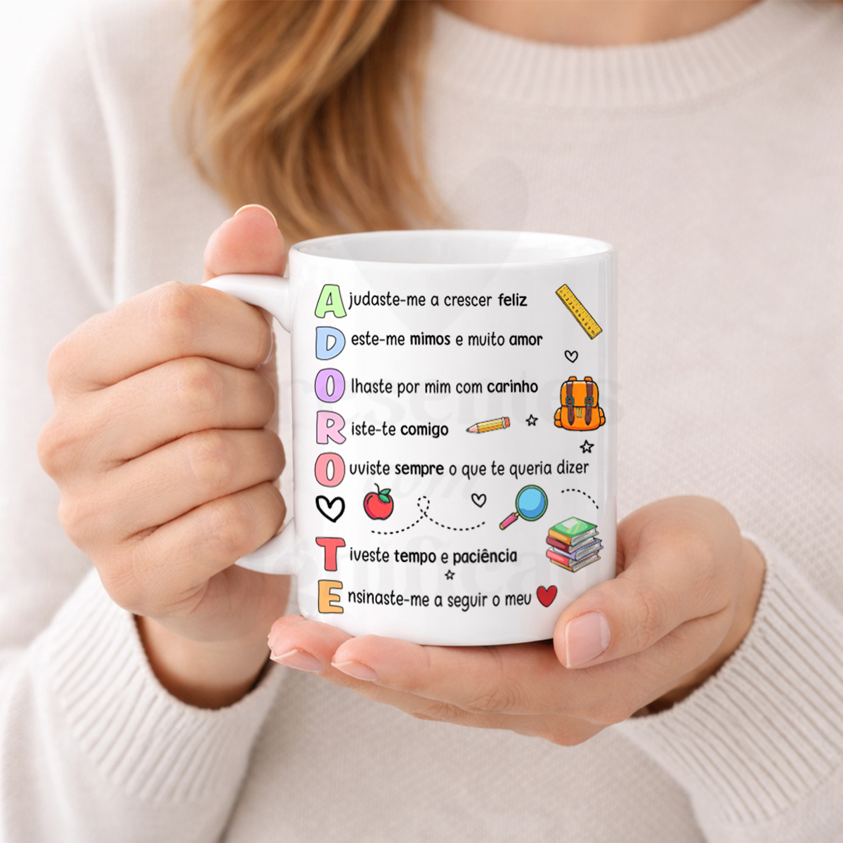 Caneca de cerâmica com texto e desenhos escolares "ADORO-TE" e frases de agradecimento. Pode adaptar para Educadora, Professora, Auxiliar, Catequista...