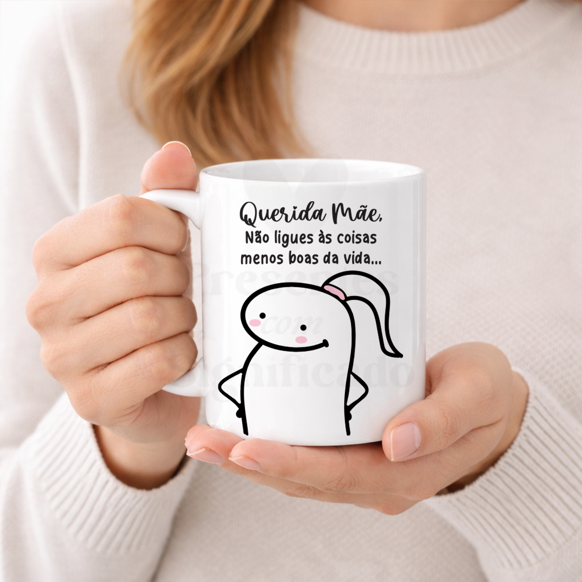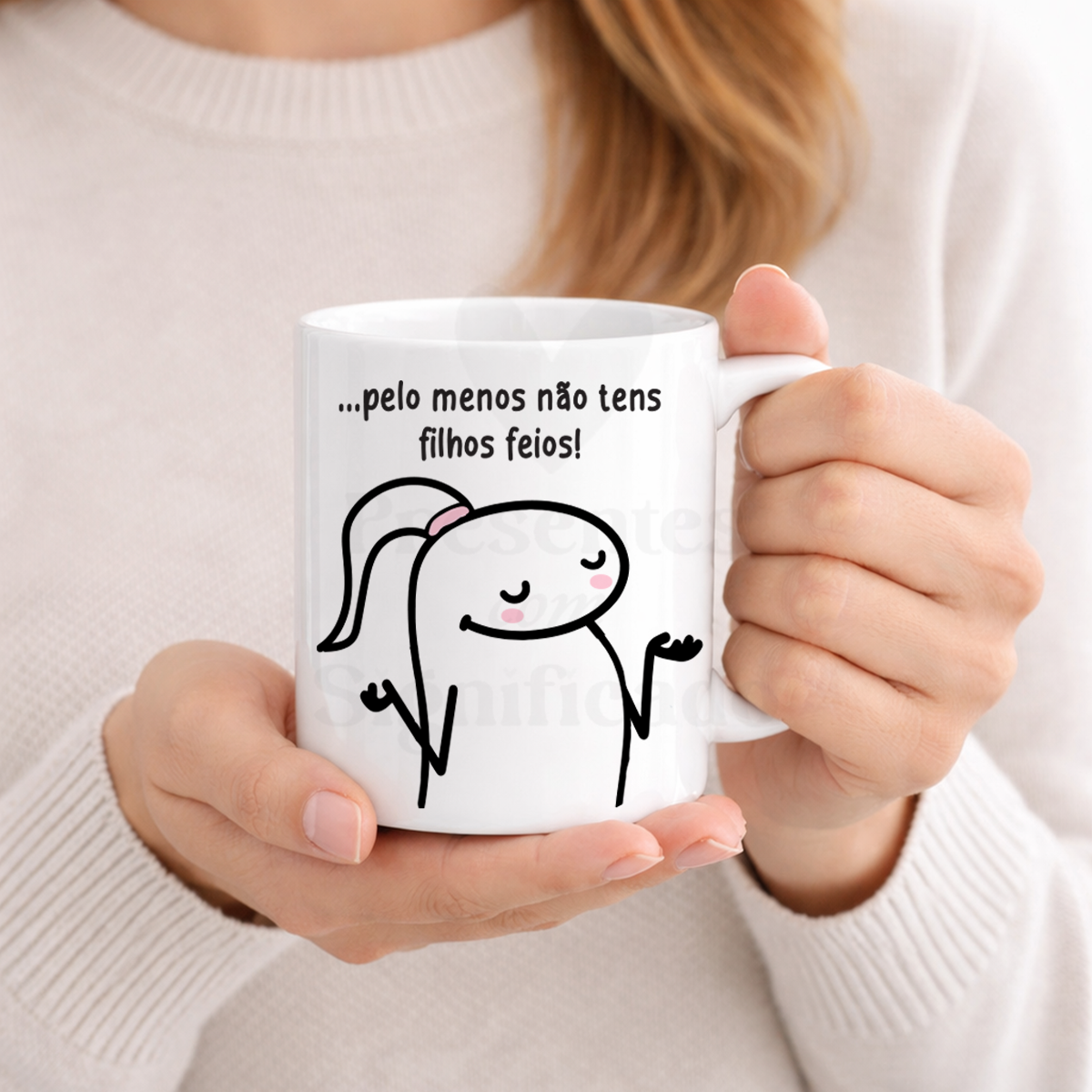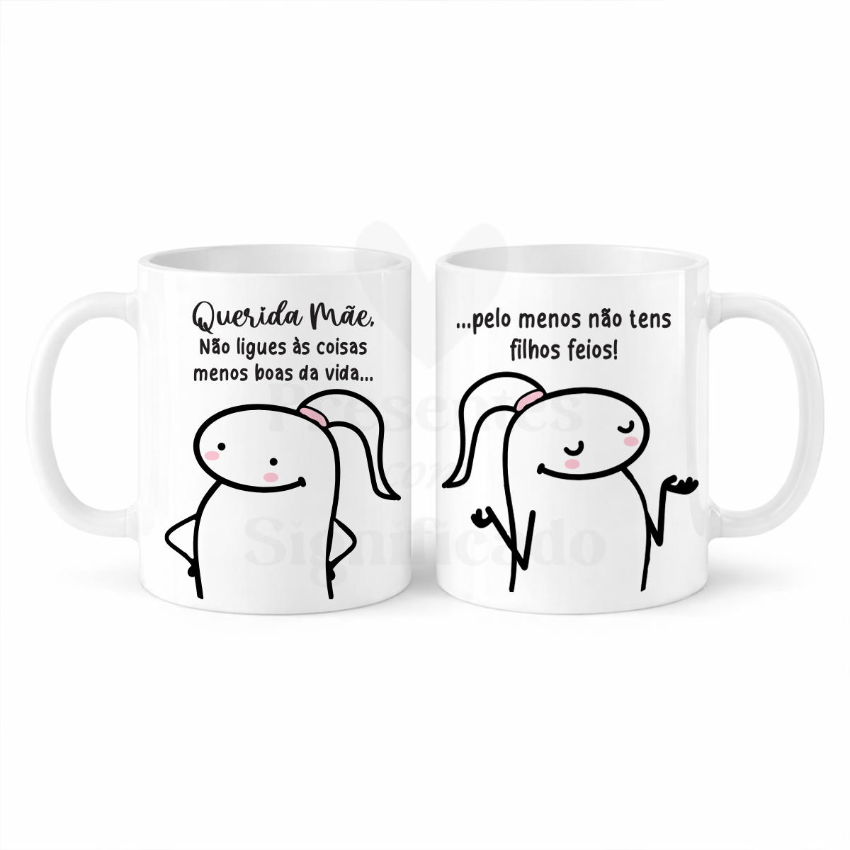 Caneca de cerâmica branca com frase "Querida Mãe, não ligues às coisas menos boas da vida... pelo menos não tens filhos feios". Adaptável para qualquer parentesco.