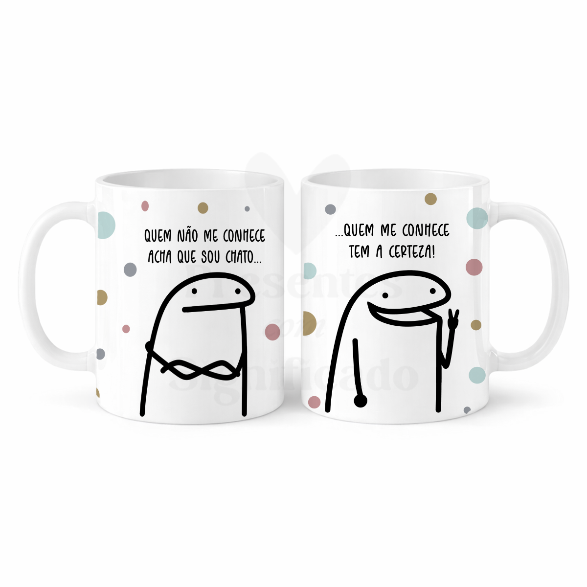 Caneca de cerâmica com imagem Flork e frase "Quem não me conhece, acha que sou chato. Quem me conhece, tem a certeza!".