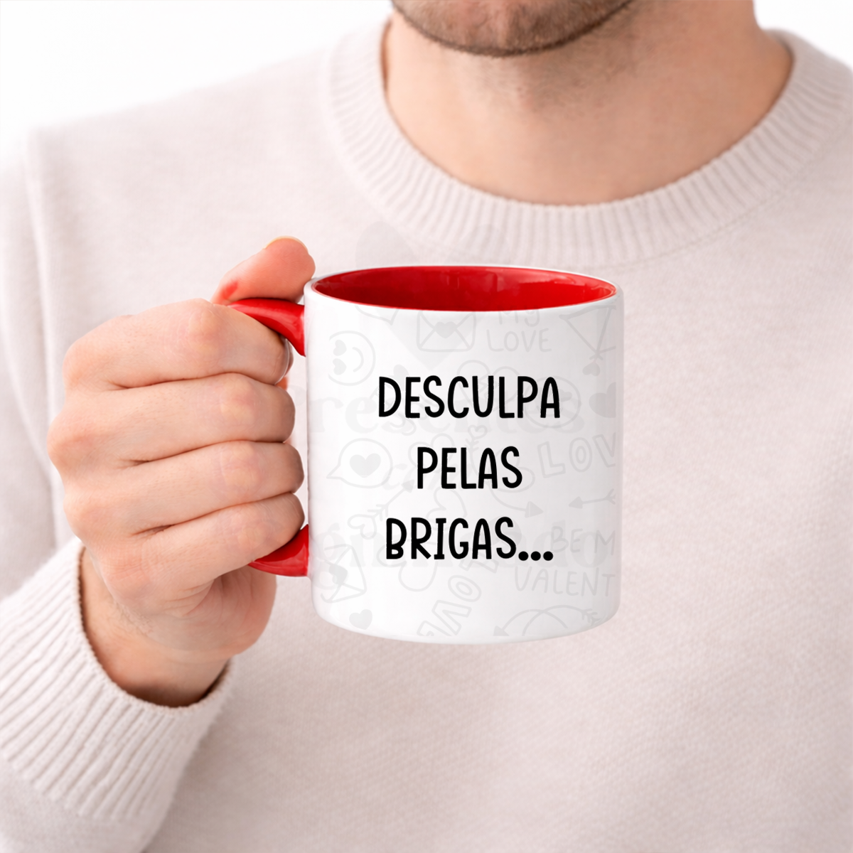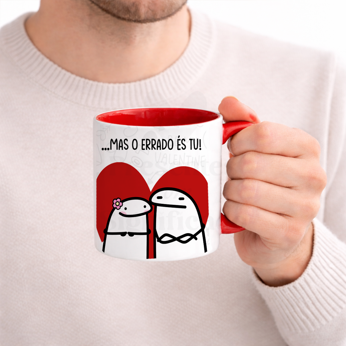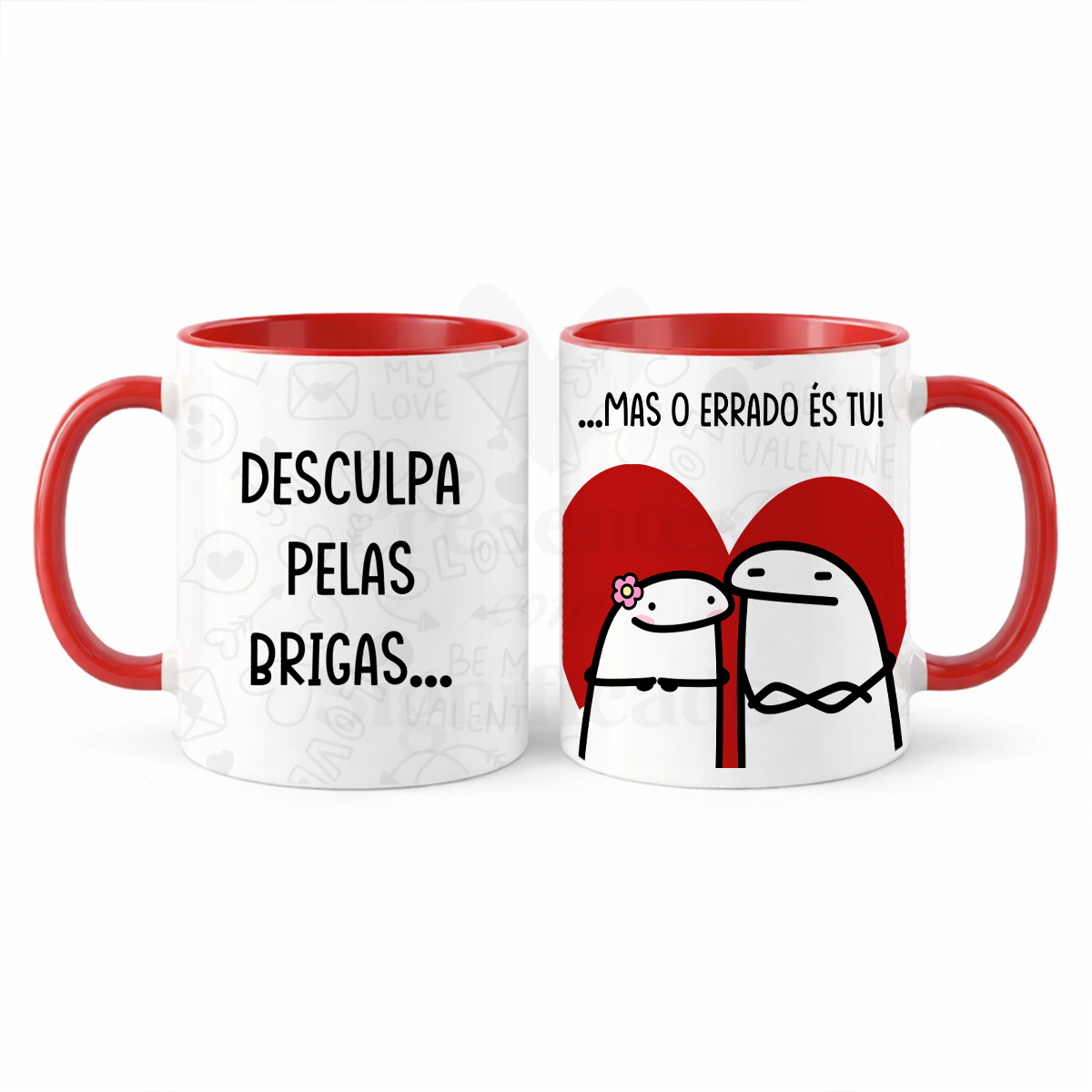 Caneca de cerâmica asa e interior vermelho com imagem Flork e frase "Desculpa pelas brigas... mas o errado és tu!". Temos mais frases desta temática, todas elas com um sentido de humor peculiar.