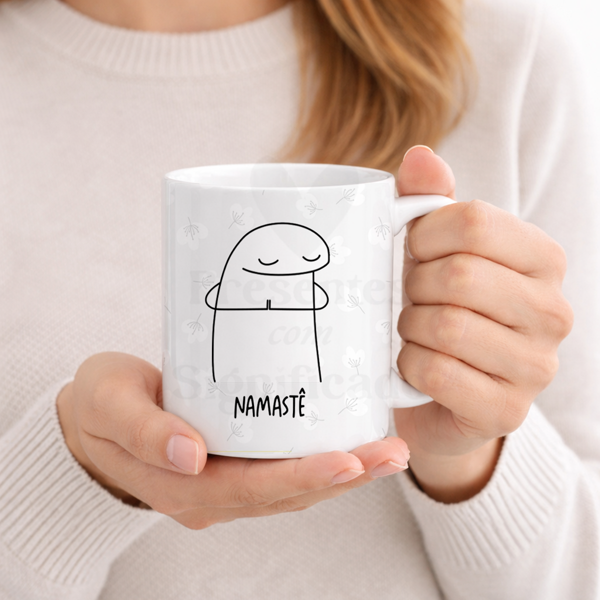 Caneca de cerâmica com imagem Flork e frase "Não desalinhes a porra dos meus chakras! Namastê".