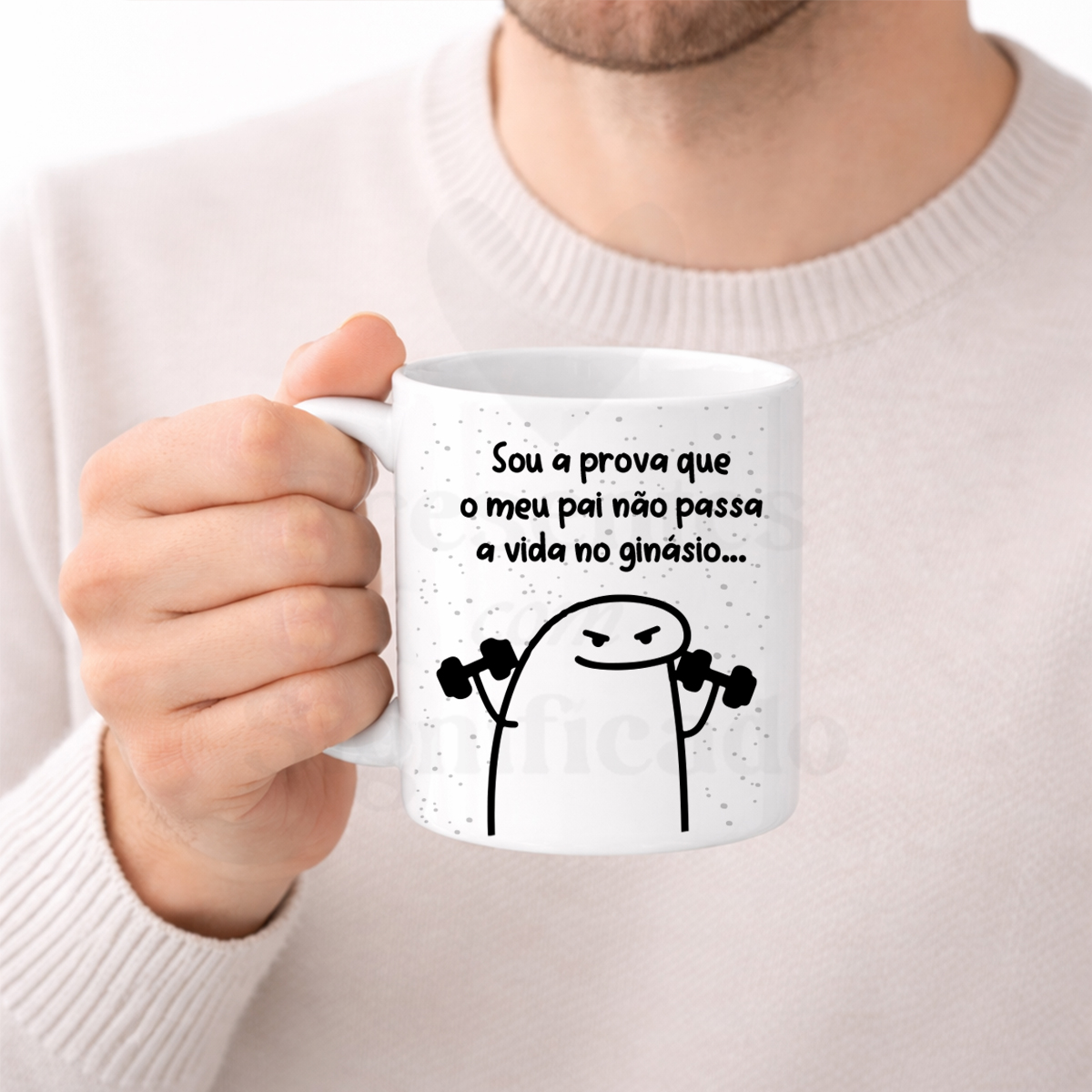 Caneca de cerâmica com imagem Flork e frase "Sou a prova que o meu Pai não passa a vida no ginásio". Pode alterar nomes/datas no texto e personalizar a foto