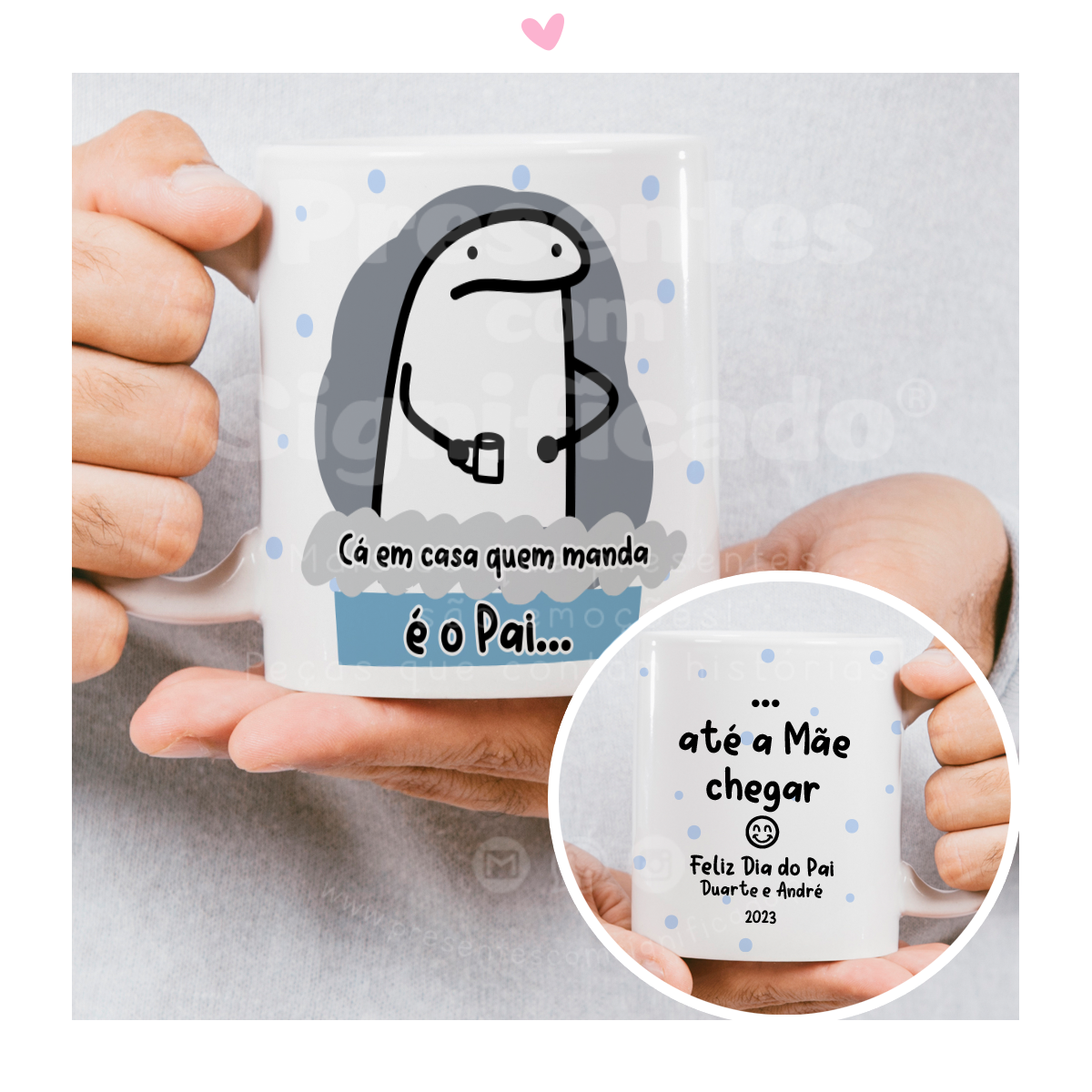 Caneca de cerâmica com imagem Flork e frase "Cá em casa quem manda é o Pai... até a Mãe chegar!". Pode personalizar os nomes/datas no texto.