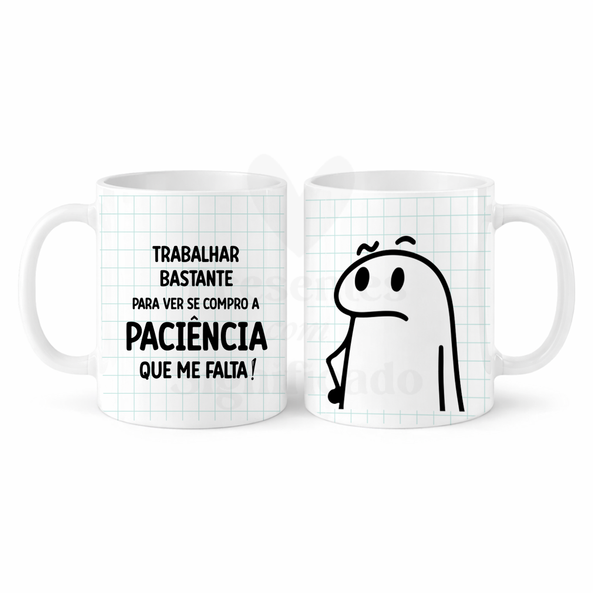 Caneca de cerâmica com imagem Flork e texto "Trabalhar bastante para ver se compro a paciência que me falta!.