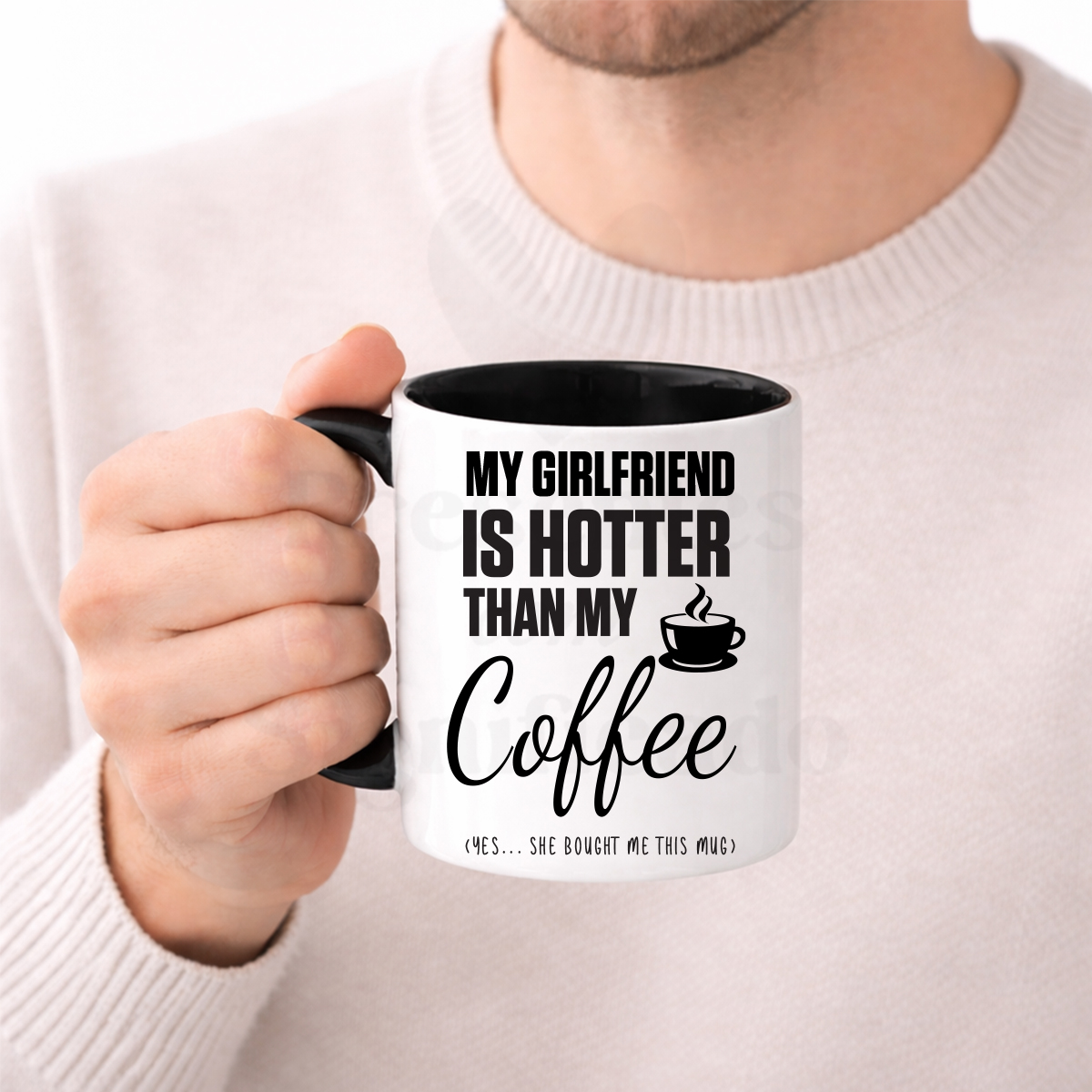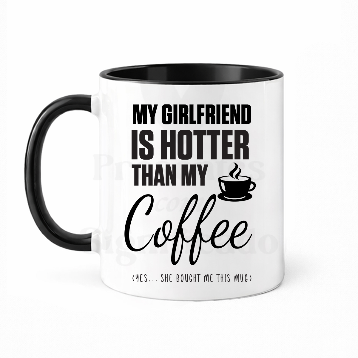 Caneca de cerâmica com texto "My girlfriend is hotter than my tea/coffee... (yes, she bought me this mug)".