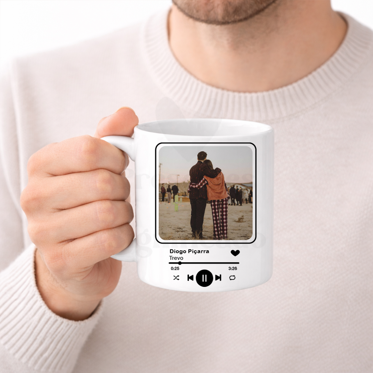 Caneca de cerâmica branca personalizada com uma foto à escolha, uma frase e com a vossa música favorita. Para colocar a música a tocar basta: