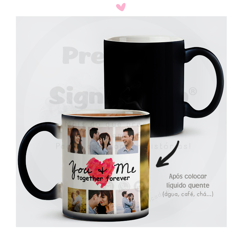 Caneca de cerâmica mágica. O exterior é preto e reage apenas com o calor do líquido no interior (chá, café, leite, etc...) mostrando a impressão que se encontra por baixo (foto e texto personalizado a seu gosto).