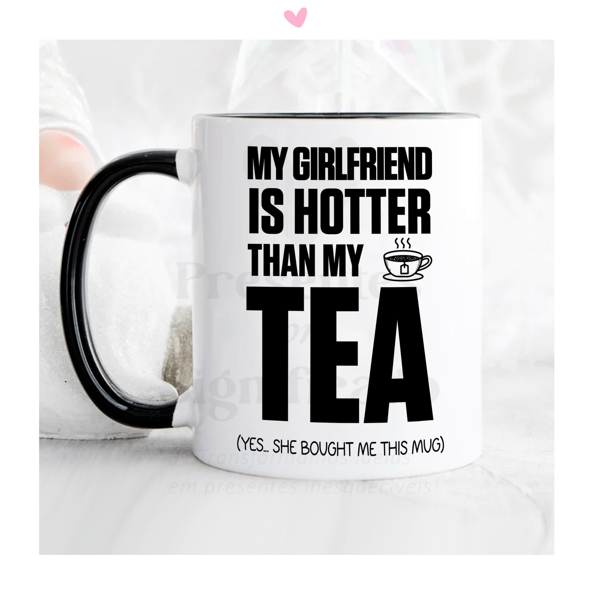 Caneca de cerâmica com  texto "My girlfriend is hotter than my tea/coffee... (yes, she bought me this mug)".