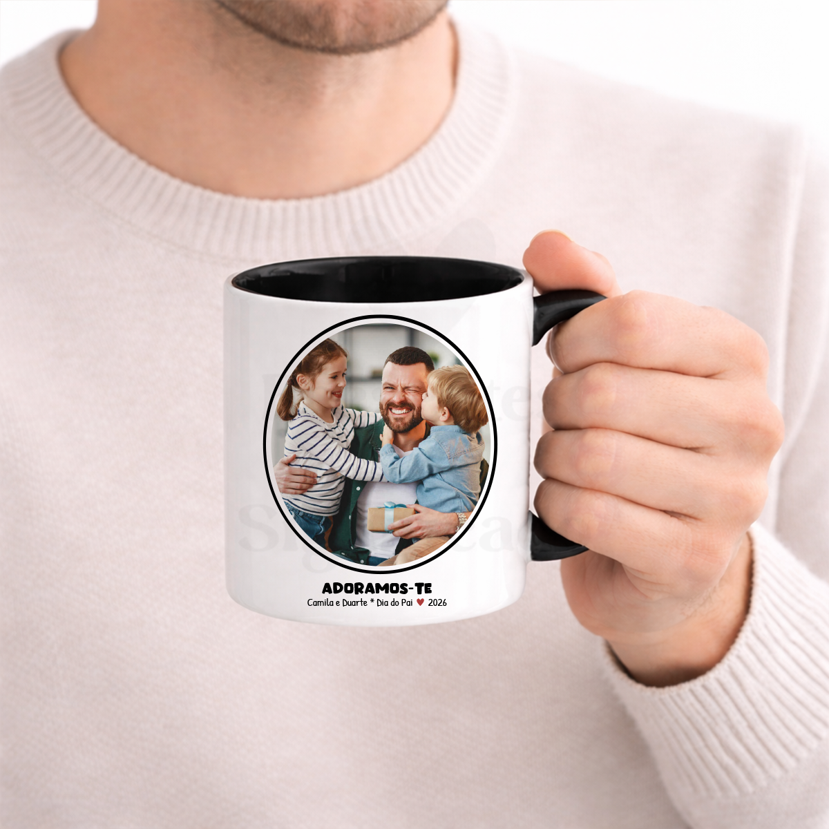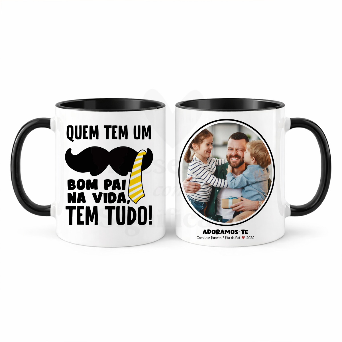 Caneca de cerâmica com foto e frase "Quem tem um bom Pai na vida, tem tudo!". Pode alterar nomes/datas no texto e personalizar a foto